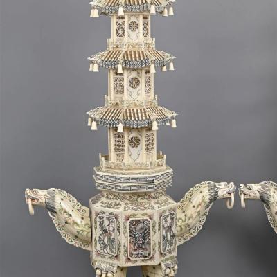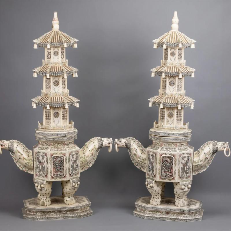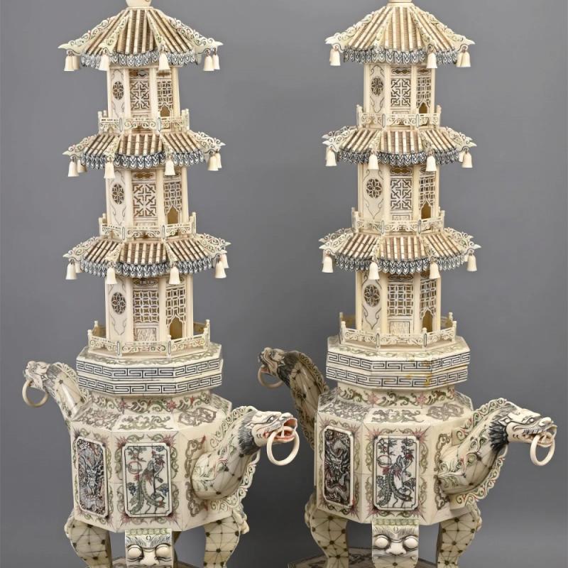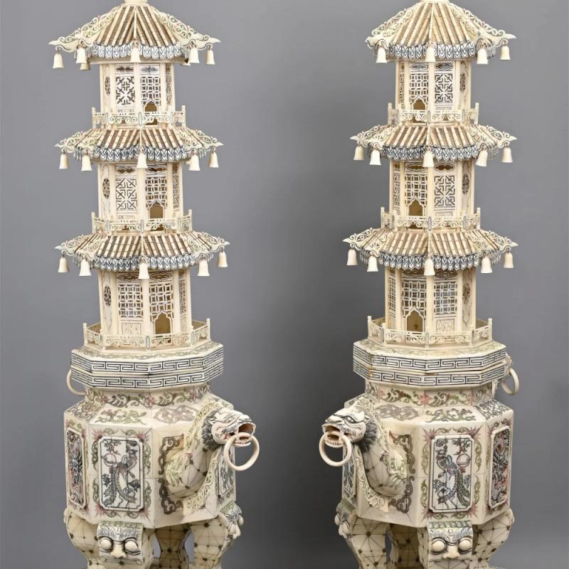 清代 大型牙雕层塔一对,高 约92cm