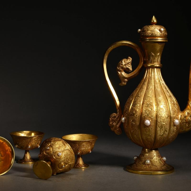 唐代镶嵌珍珠金银酒壶一套,壶尺寸:14×9×19.3cm 重1240g