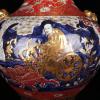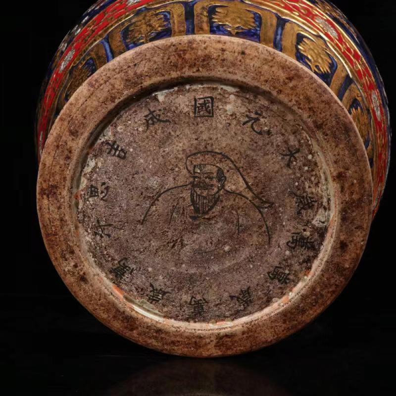 元代 青花釉里红浮雕鎏金鬼谷下山纹狗头罐一对,高端大气,气势磅礴,鎏24K黄金,包浆厚重,世间罕见,瓶底写有(大元国成吉思汗万岁万岁万万岁)。 高宽:74*48cm