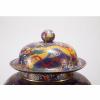 旧藏 大清乾隆年制铜胎景泰蓝掐丝珐琅大罐,极为罕见,包浆厚重,老化明显,五爪腾飞造型威猛 ,造型巨大。The heavy jar with high shoulder is finely decorated on the body with two ferocious, scaly, yellow five-clawed dragons striding amidst multi-colored scrolling clouds against clouds ground and below a petal band, all against a lapis-blue ground. The domed cover is decorated with a third five-clawed dragon in yellow below the spherical finial decorated with lotus lappets. The base and interiors are gilded.