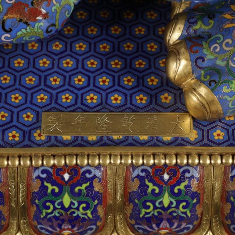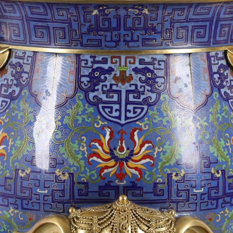 由于金属胎珐琅器的制作用材昂贵,工艺复杂,釉料配置和烧造技术难度大,生产成本高,所以制造数量很少,明清时期珐琅器一直为皇家垄断生产,产品也大多供宫廷使用,民间涉足不多。本品为铜胎掐丝珐琅香熏及太平有象花觚一对,一套三件,品相完整,保存无缺,极为罕见。熏炉以太平有象为题材,身姿沉稳,做工精良,器形大气,造型大方,三象足支撑有力,结构合理;象鼻耳于炉身两侧,高高上翘,线条优美;炉盖以卧象为钮,装点宝相花,细部刻画入微,镂雕云蝠纹饰,点香后香气氤氲,从镂空处屡屡飘散,极为精彩。香熏配铜胎掐丝珐琅花觚一对,大小相当,搭配适宜。花插为宝瓶象座制式,卧象托着花觚,其造型源自上古青铜器,并配有鎏金螭龙耳,通体以缠枝莲纹为饰,典雅华丽。花觚下有象座,卧象形象生动,回首卷鼻,毫不呆板,象鞍以掐丝珐琅工艺饰六方龟甲锦纹,珐琅填施饱满,掐丝纤细精致,逾显清雅。香熏及花觚鎏金璀璨,色泽明亮,缤纷莹透,温润自然,鎏金处宝光鲜亮,诸彩妍美,填涂细腻。审其工艺繁缛,造型复杂,一器之成必将费时日久,人力物力不可计数,故此类多见内府制作。