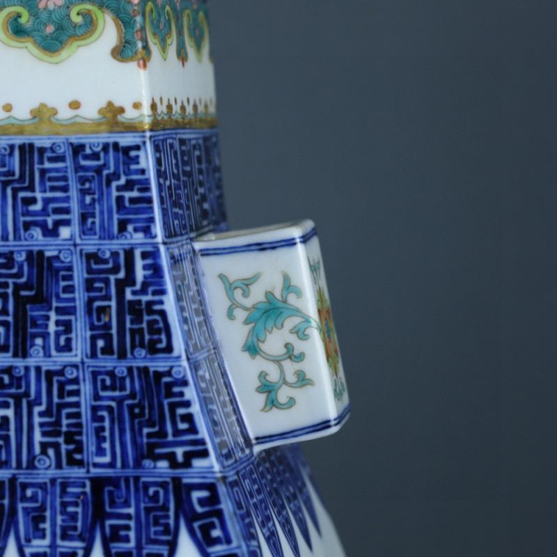 清乾隆 青花粉彩花卉纹贯耳四方瓶 高度34.3cm,口径13.6cm,肚径23cm。