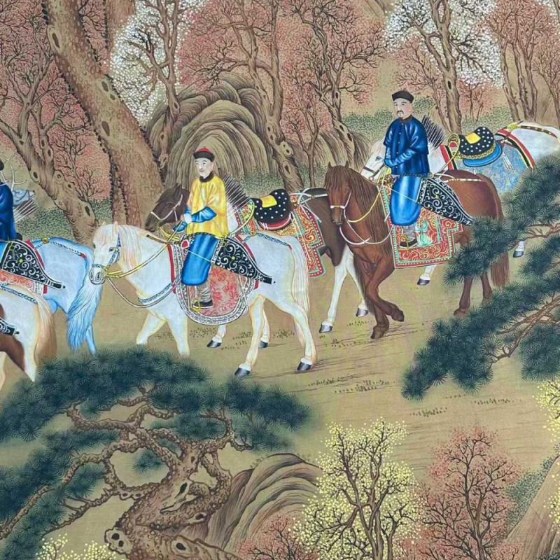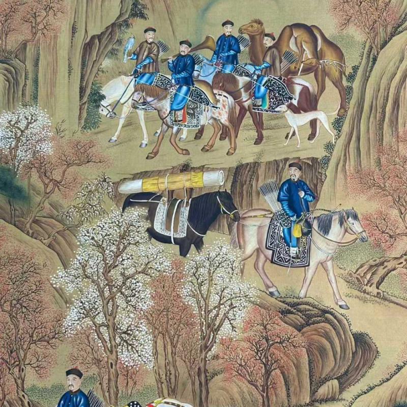 郎世宁精品手绘丝绢《哨鹿图》长卷,用色保存良好,