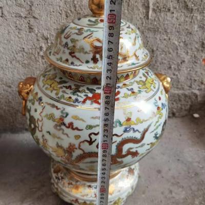 明代-宣德御制 五爪金龙鎏金五彩大罐一对,保存完好,龙形威猛,龙形造型是明代宣德年间典型的皇权五爪龙特征。尺寸54ⅹ30cm。