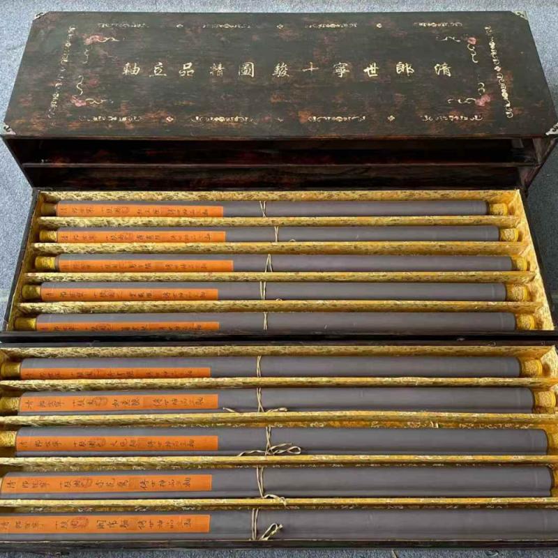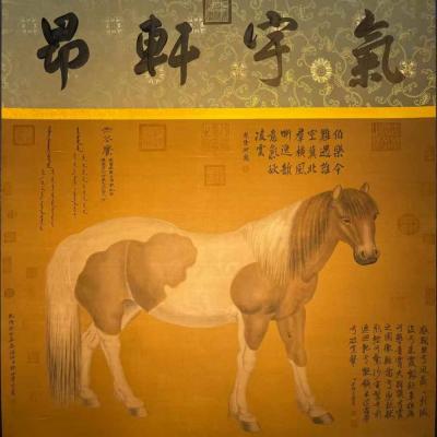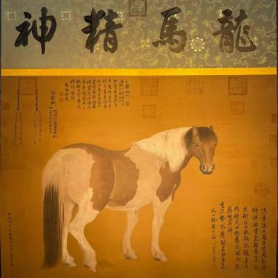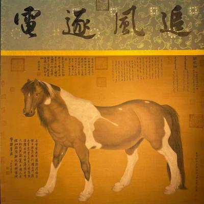 郎世宁精品手绘绢本画《十骏图》一套【画盒珍藏】,《十骏图》是意大利传教士画家郎世宁于乾隆八年(1743年)奉旨创作的系列绢本设色画作,该系列完整描绘蒙古各部进贡的十匹名驹,采用解剖学写实技法与中式笔墨结合,体现清代宫廷绘画中西合璧的典型特征。每幅画作均标注进献者信息并配有乾隆御题诗文,被《石渠宝笈初编》列为"上等品",具有重要艺术史价值与文物研究价值,意大利传教士郎世宁1714年进入清宫供职,历经康雍乾三朝,首创融合西洋光影技法与中国传统工笔的绘画风格。乾隆八年(1743年),蒙古诸部向清廷进献十匹名骏,乾隆皇帝特命郎世宁绘制《十骏图》以彰武功,每幅作品均记录马匹来源及体态特征 。全套作品包含以下十幅独立画轴