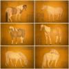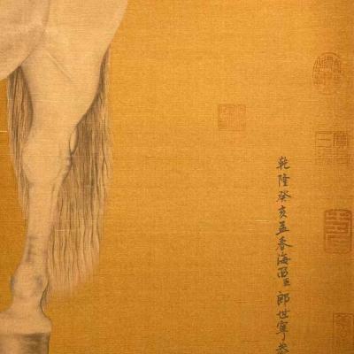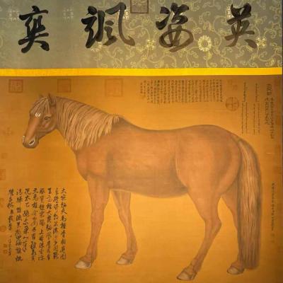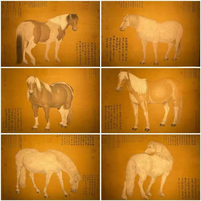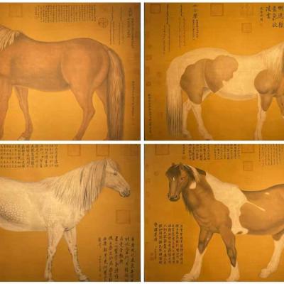 每匹马匹名称均体现其毛色特征与祥瑞寓意,如"霹雳骧"象征迅猛,"英骥子"寄托贤才期许 。郎世宁运用透视法精确表现马匹解剖结构,通过细腻渲染展现肌肉纹理与皮毛光泽。创新采用中国画颜料绘制西洋式立体造型,马匹背景保留传统留白技法,形成虚实相映的视觉效果。丝绸鞍鞯纹饰采用工笔重彩,与写实马身形成质感对比!