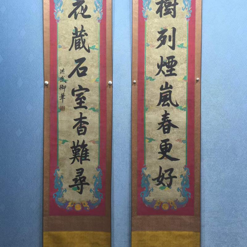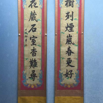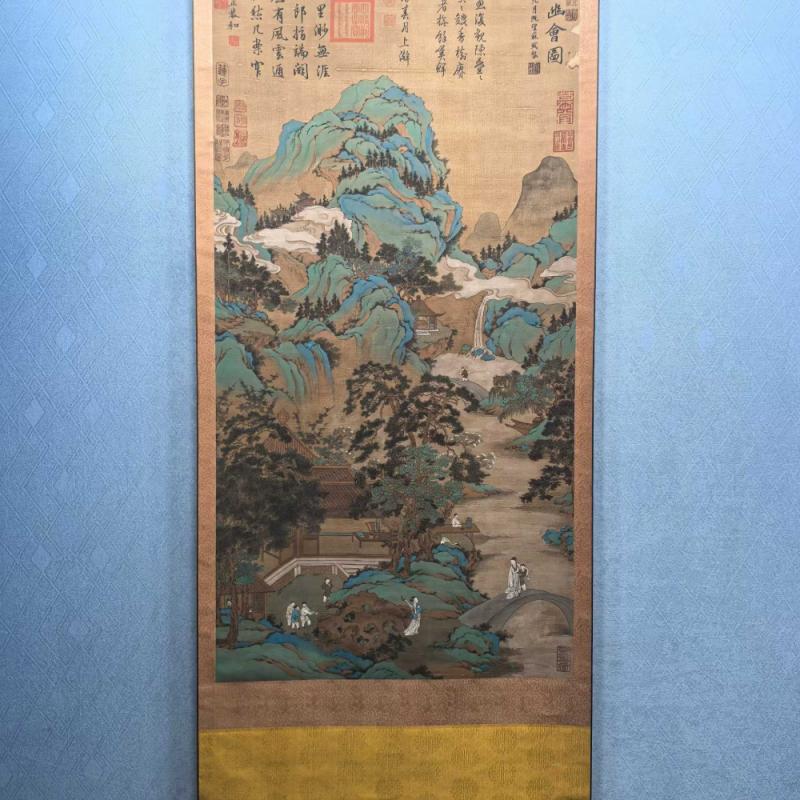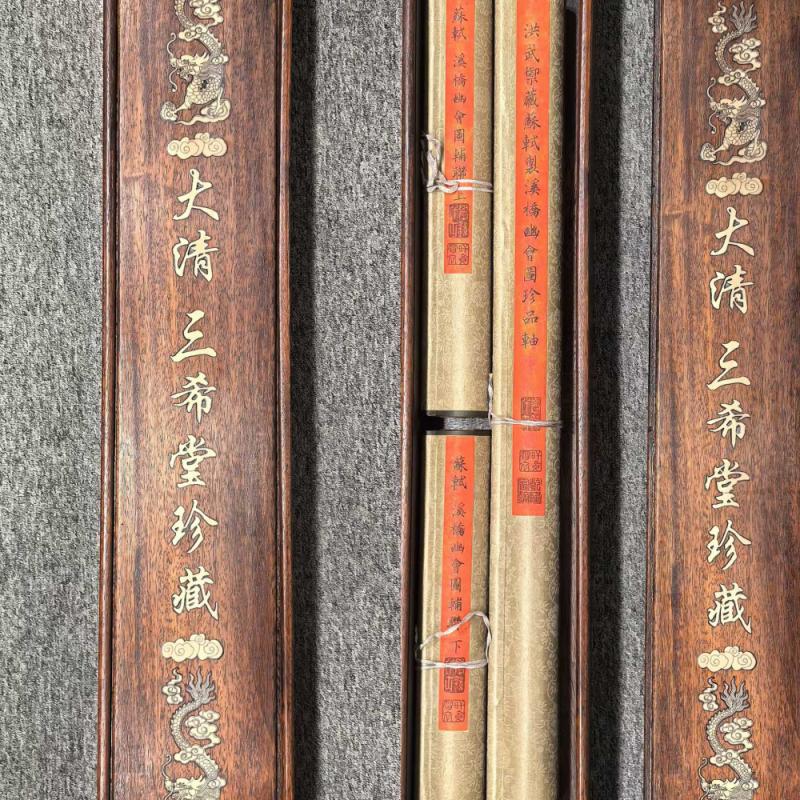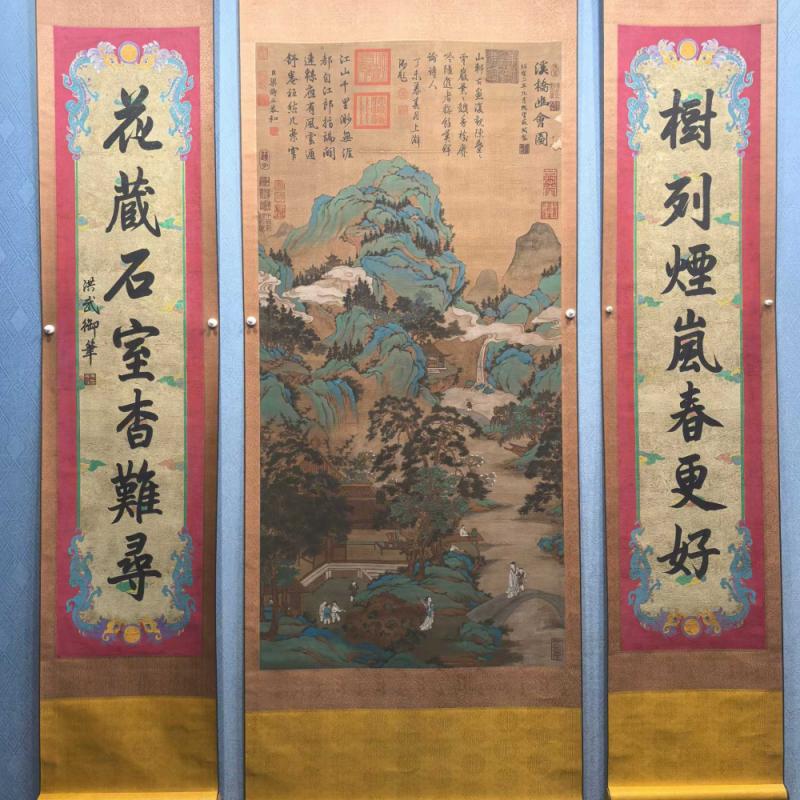大清三希堂珍藏 苏轼 精品绢本:溪桥幽會图 立轴画心尺寸:65✕134厘米 单屏对联尺寸:31✕134厘米