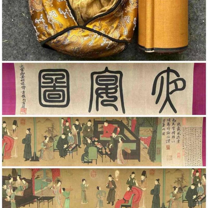 五代、顾闳中精品绢本(韩熙载夜宴图。手卷 规格:画心尺寸:31x325总长:778厘米 拍品介绍:此画实物拍摄,韩熙载夜宴图。图卷描绘了官员韩熙载家设夜宴载歌行乐的场面:宴罢聆听、击鼓伴舞、画屏小憩、玉人清吹、夜阑余兴,每段用屏风作为场景分割,整幅作品线条遒劲流畅,工整精细,构图富有想象力,且富于层次感,神韵独出。(收藏最高—神品)