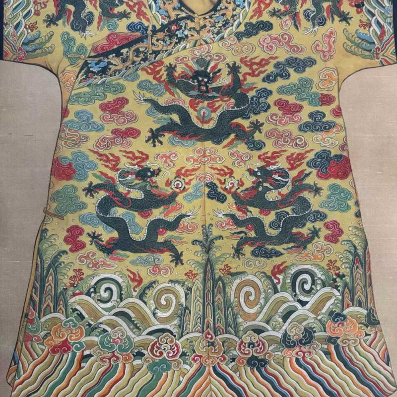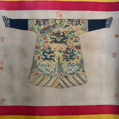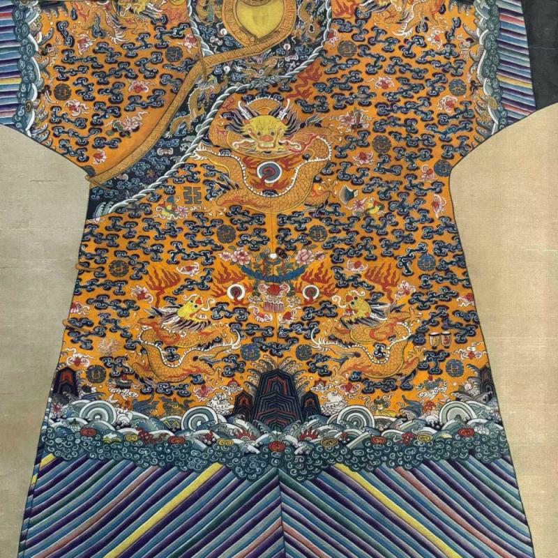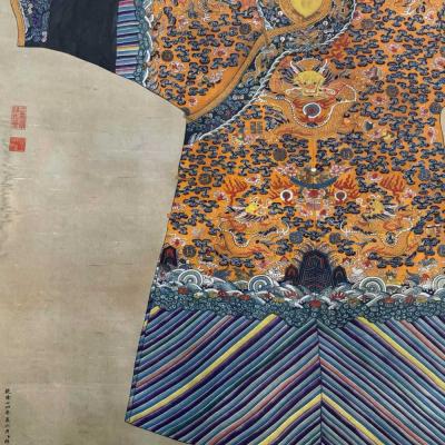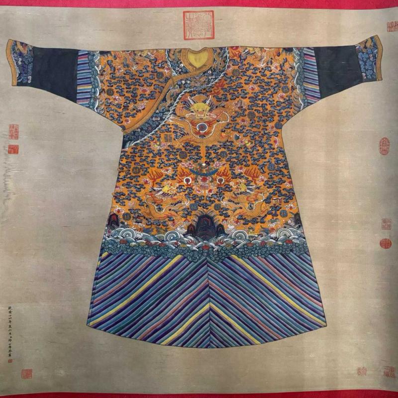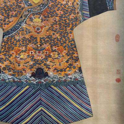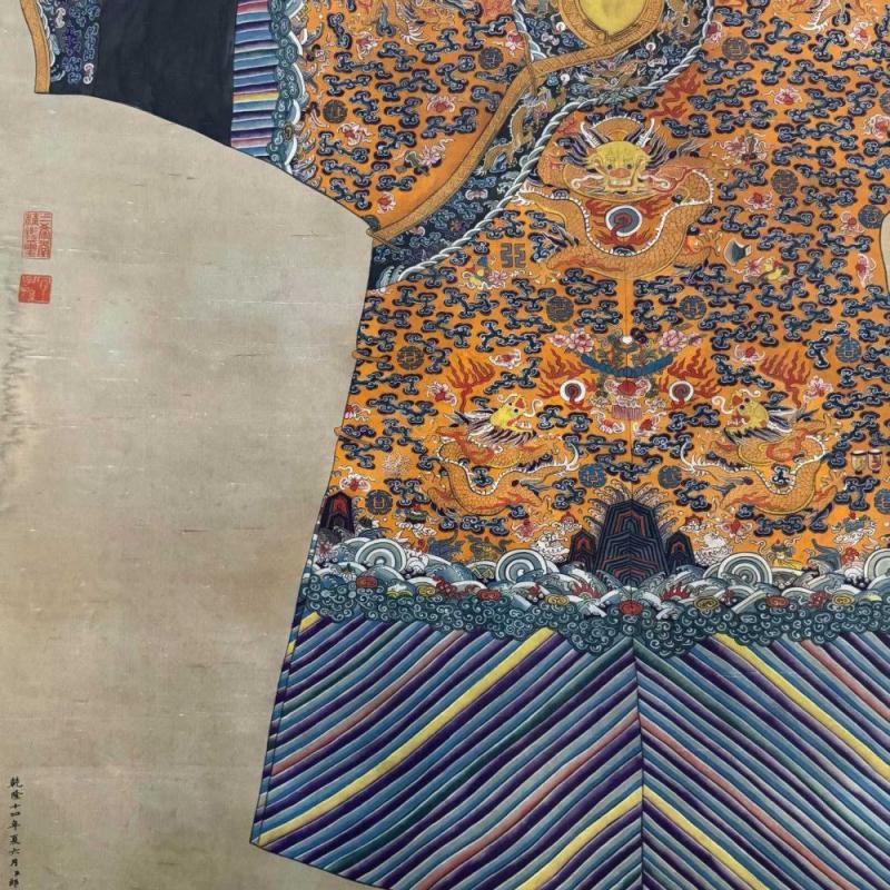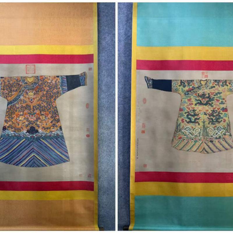 清、郎世宁、精品绢本(双龙袍)单幅画心尺寸:105x99厘米、102x77厘米。龙袍是中国古代皇帝专属的礼仪服饰,既是皇权的核心象征,也是中华文明中天人合一思想的集中体现。