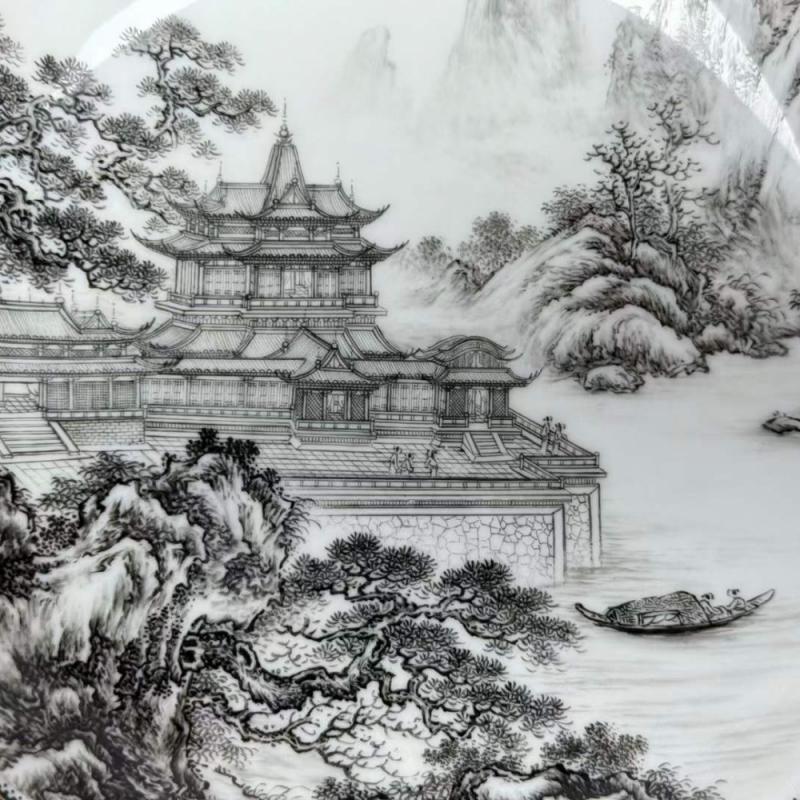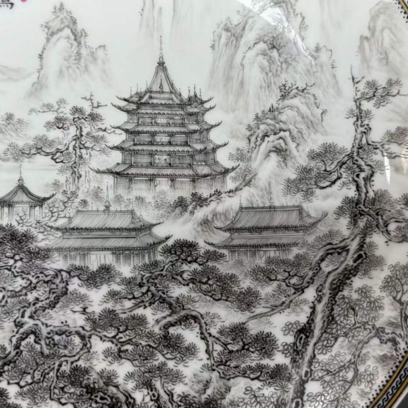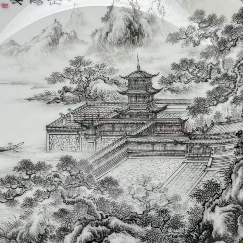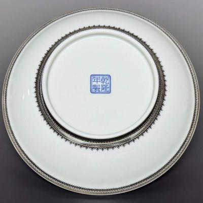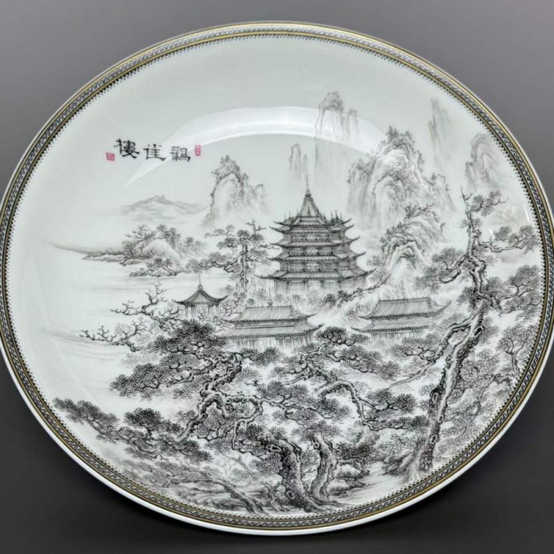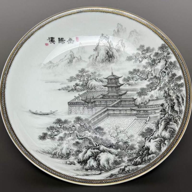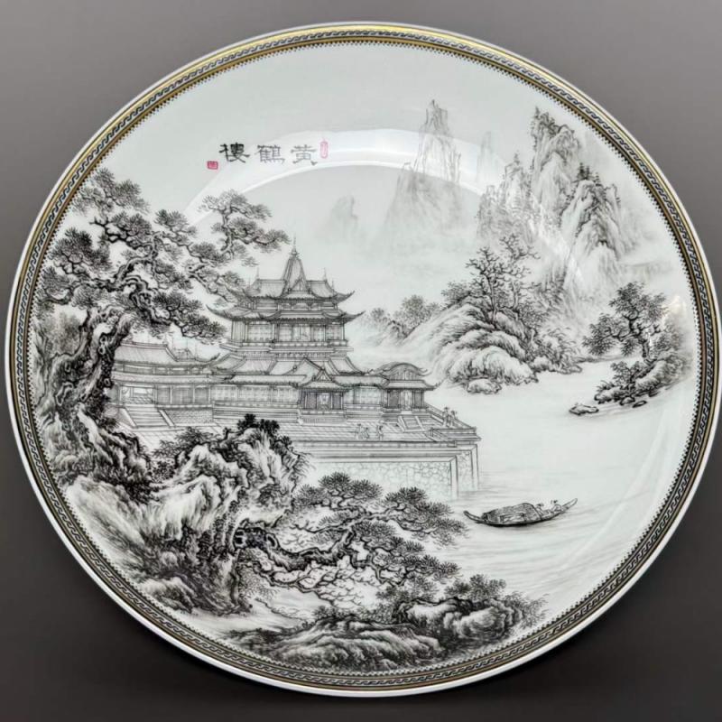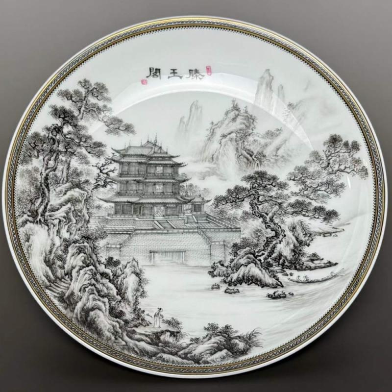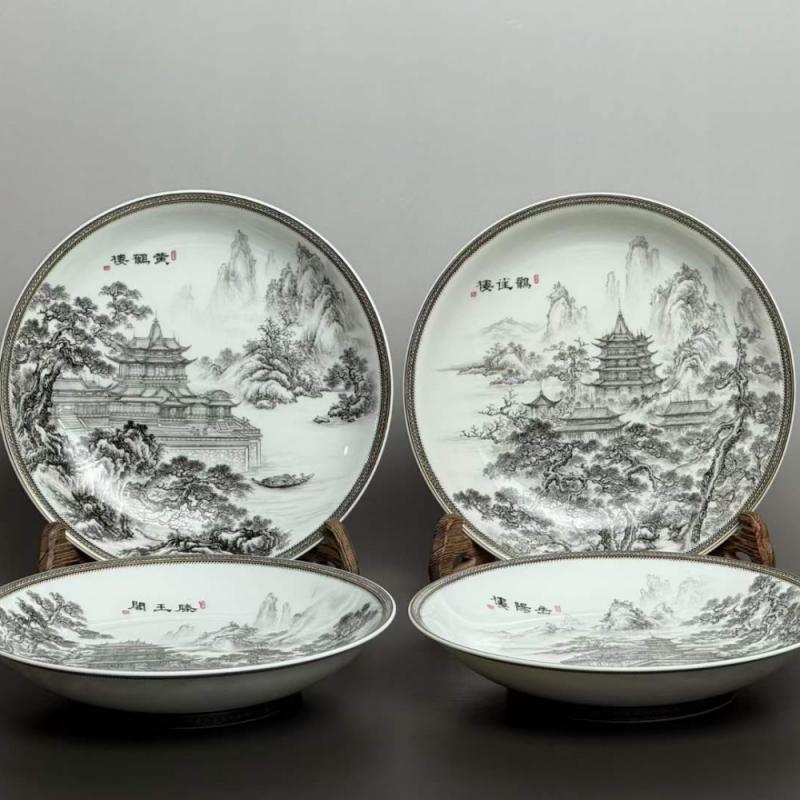 乾隆年制 墨彩描金图案边 四大名楼 赏盘一套 尺寸:口径17.8厘米,高3.8厘米,底径9.8厘米。