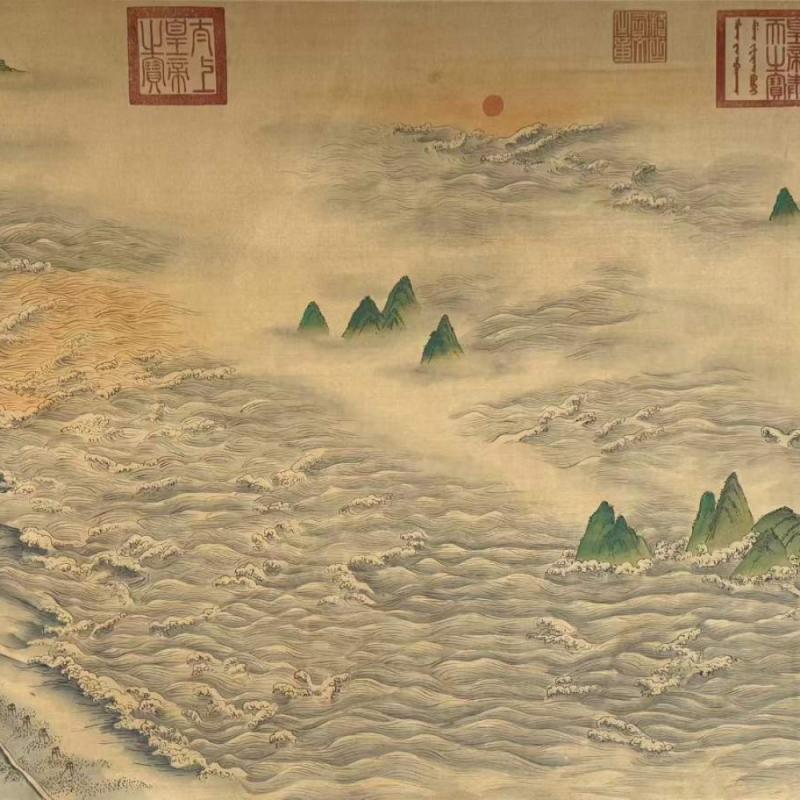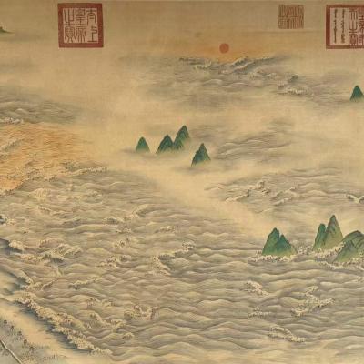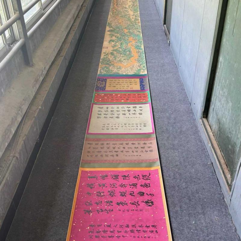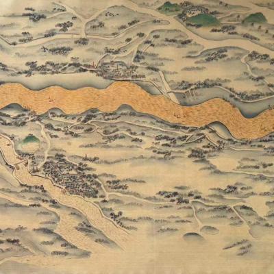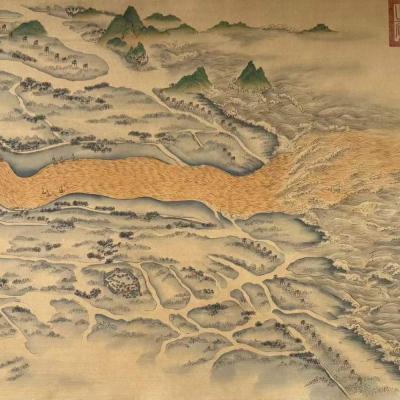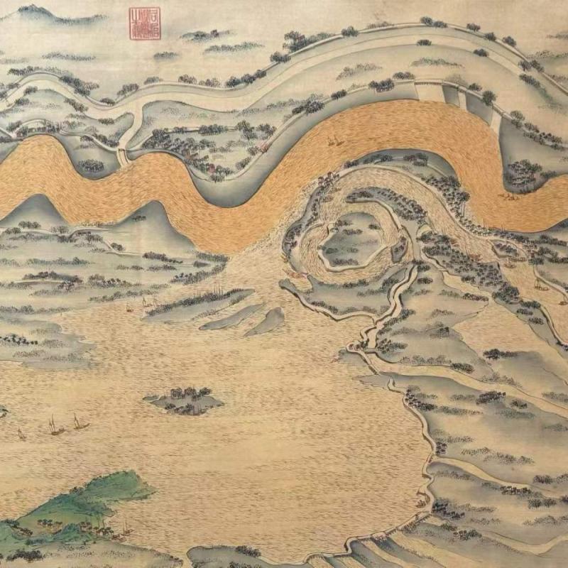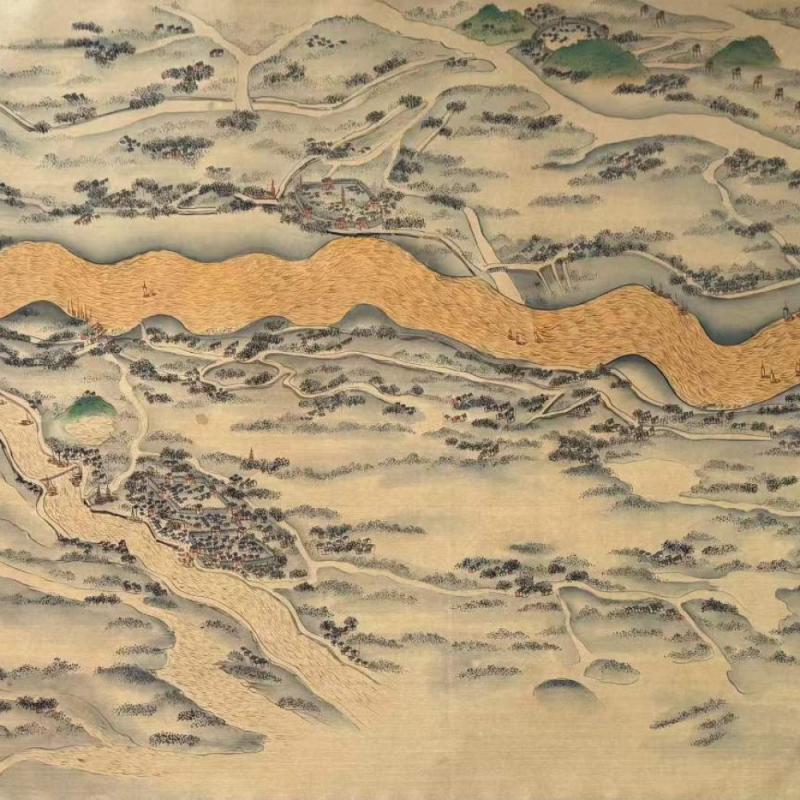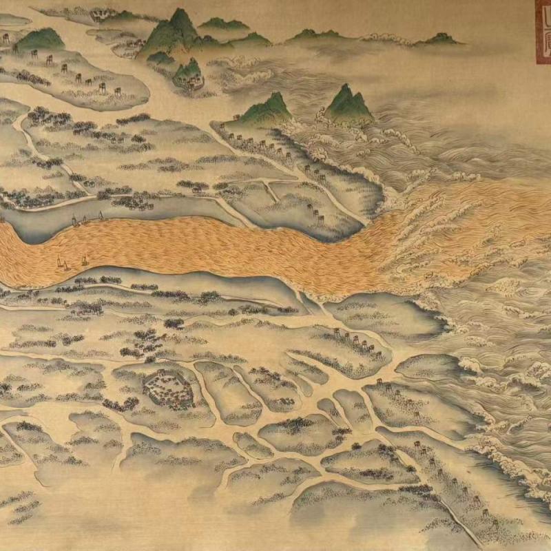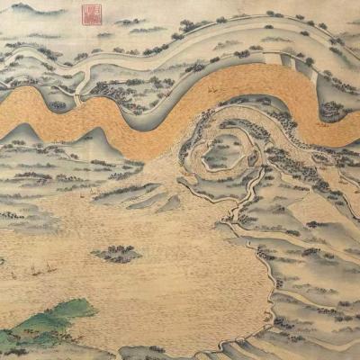 明、仇英、精品绢本(黄河万里图)第一段,画心尺寸:68x1055厘米,总长:1762厘米。手卷