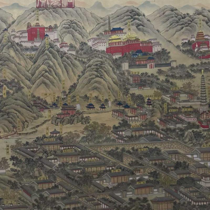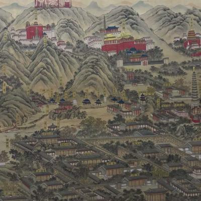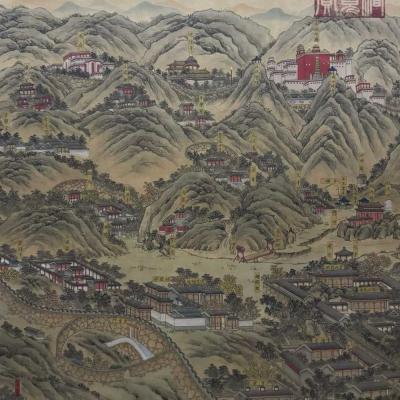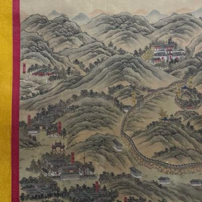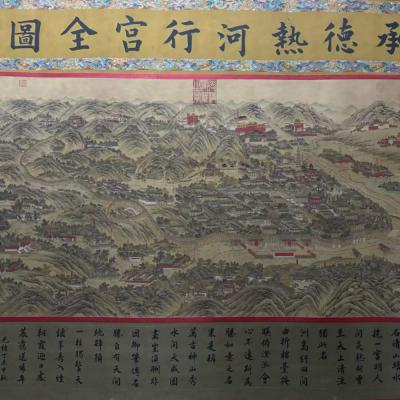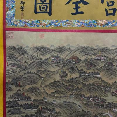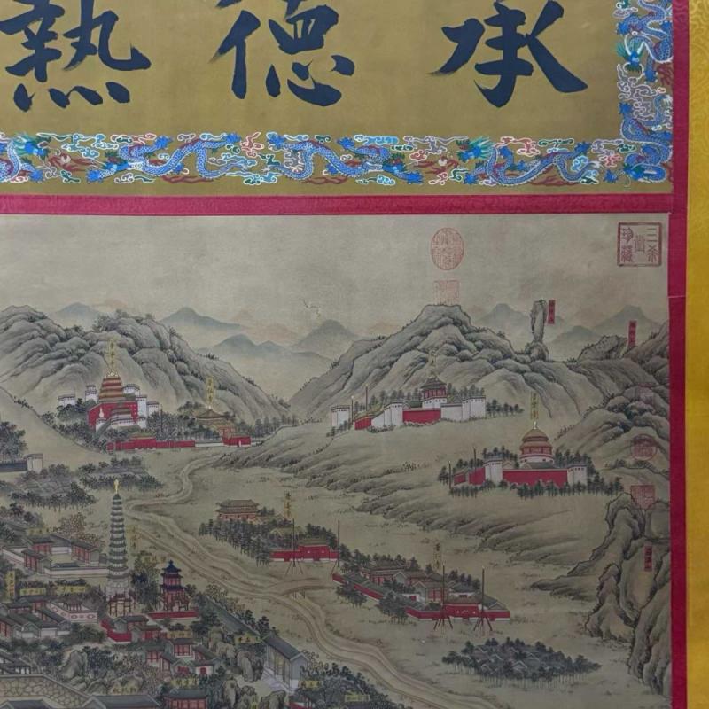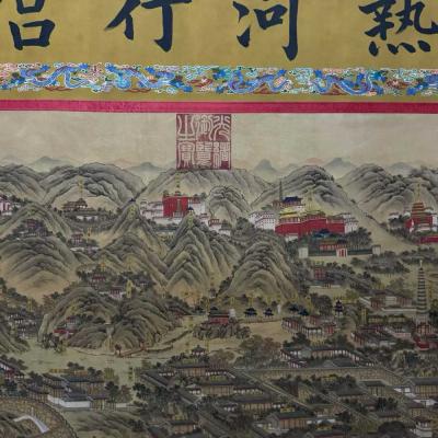 拍品介绍:此画实物拍摄,热河行宫图。全图以俯瞰全景的方式,精细描绘清皇室在热河的行宫(避暑山庄)及宫苑内庭园景致与周围寺庙建筑等。占地五百六十四万平方公尺。除宫苑园林,山庄外另修建了“外八庙”。外八庙其实是十二座佛教寺庙;八座分布在山庄外北部、东北部的山丘地带,图中所见,自西迄东,依次是:罗汉堂、广安寺、殊象寺、布达拉庙、福寿庙、普宁寺、普佑寺等。。。(收藏最高境界—神品)