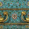 此铜胎掐丝珐琅冰箱从外观上看美观大方,冰箱口大底小呈方斗形,腰部上下饰箍铜纹两周。口沿饰回纹装饰。箱两侧有铜鎏金双环,铜环的用途就是便於搬运。箱口覆两块对拼盖板,板上镂雕钱形孔。此器通体施天蓝色珐琅釉地,通景饰缠枝莲纹,布局工整有序,枝叶繁茂卷曲,舒展大气。冰箱下设红木兽蹄足带托泥承座,牙板及兽足上部亦嵌铜胎掐丝珐琅板,饰兽面纹、缠枝莲纹,视觉效果突出,与上面铜胎掐丝珐琅冰箱上下遥相呼应,凸显出当时宫廷技艺之精湛,工序之繁缛,应出自清宫内务府造办处之佳作。