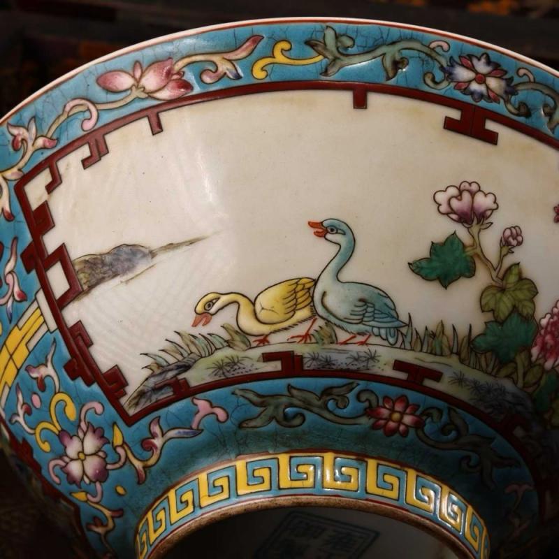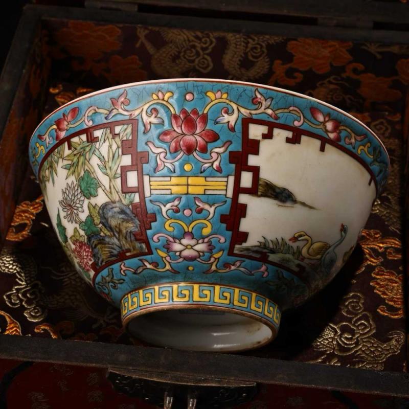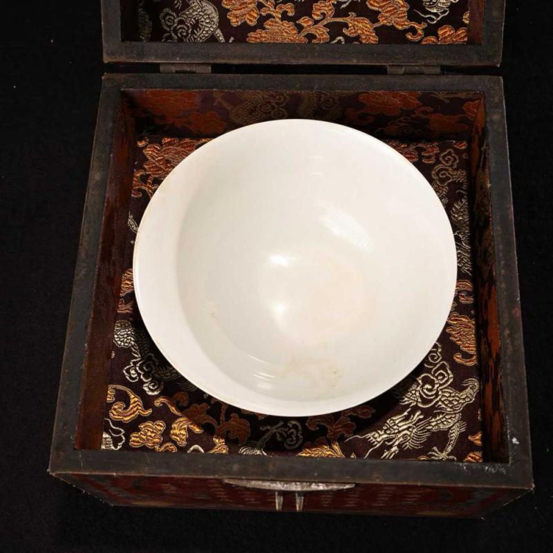 珍品旧藏收清代宫廷御藏罕见手绘粉彩花鸟瓷碗 品相保存完好 画工精湛 配有老高浮雕木头彩绘盒子一个 盒子高18厘米 宽18厘米 碗重225克 高7厘米 直径15厘米