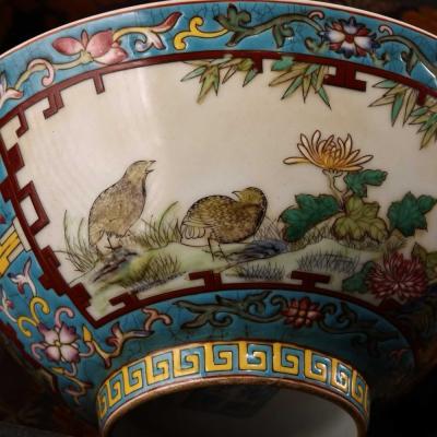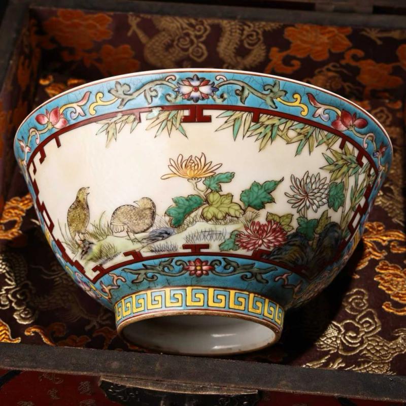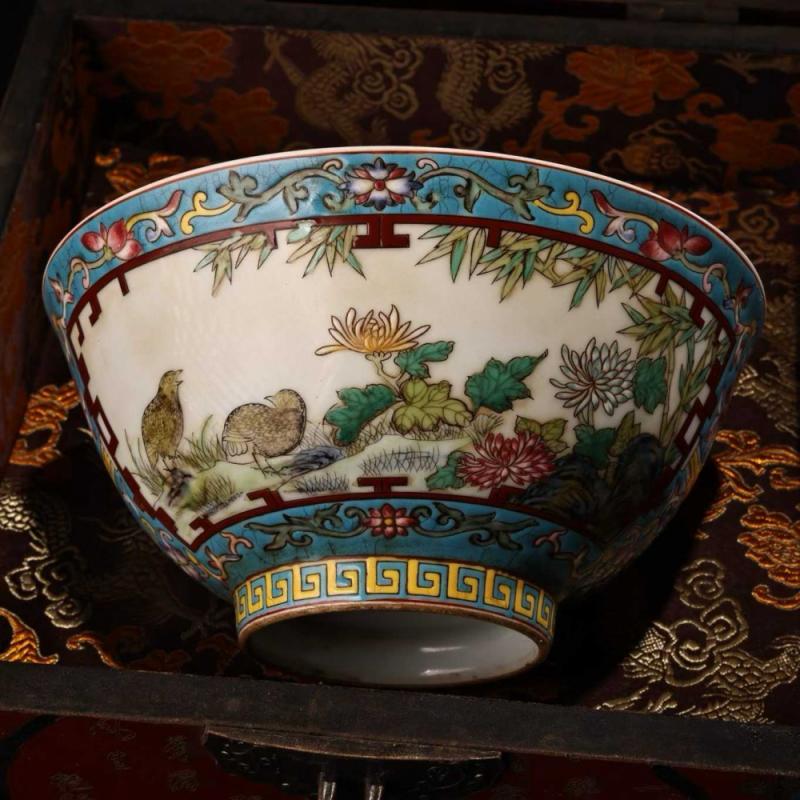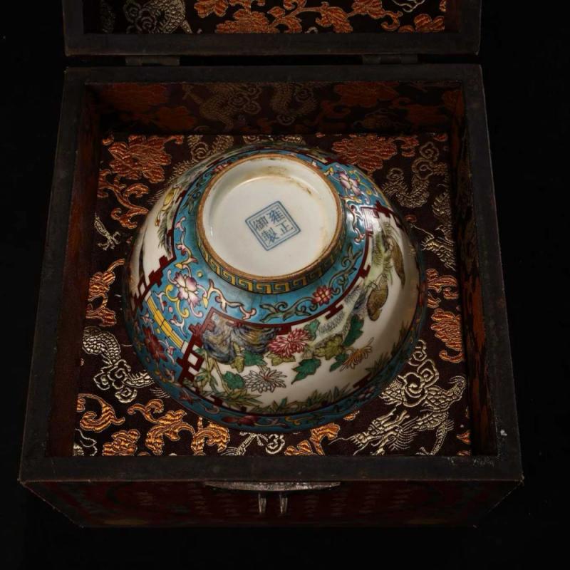 珍品旧藏收清代宫廷御藏罕见手绘粉彩花鸟瓷碗 品相保存完好 画工精湛 配有老高浮雕木头彩绘盒子一个
