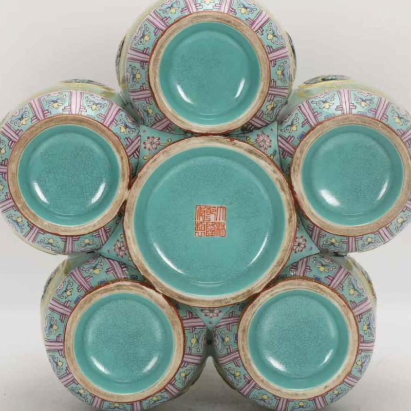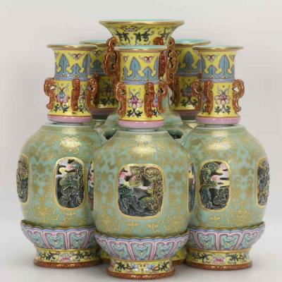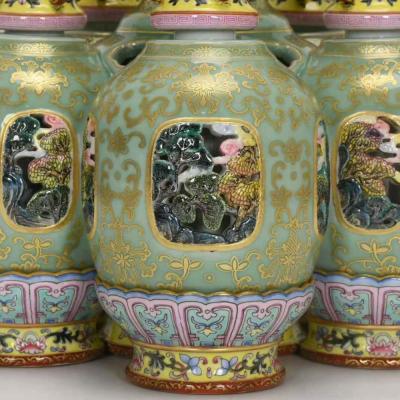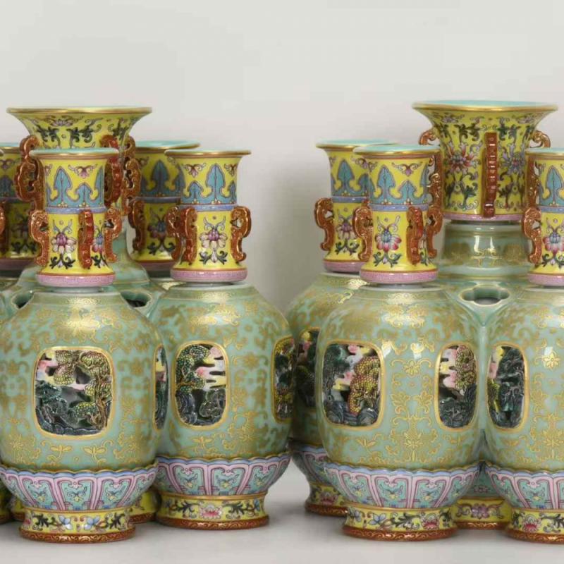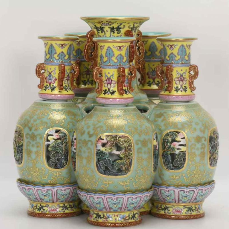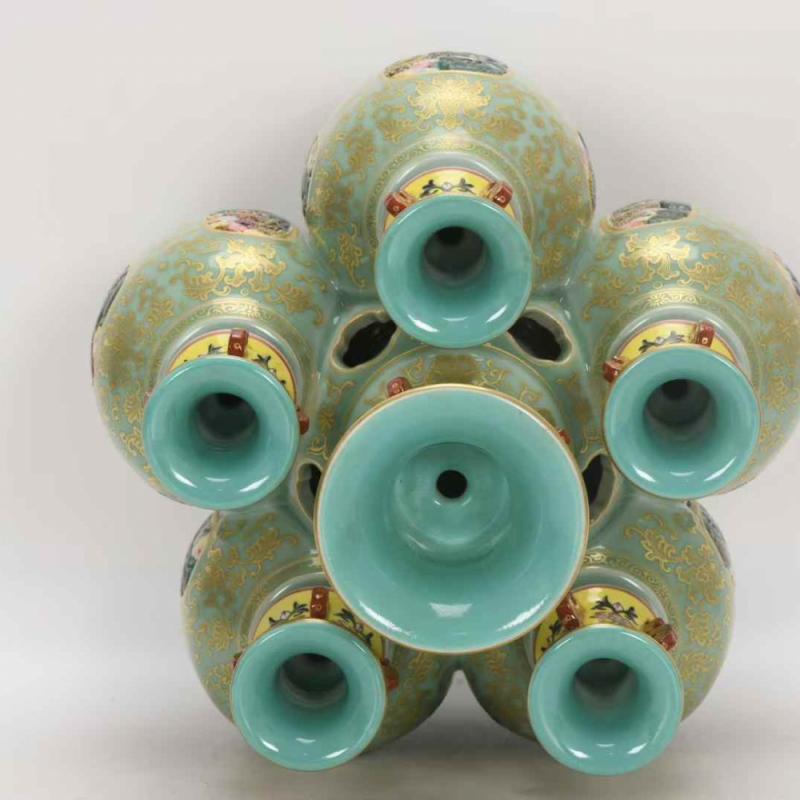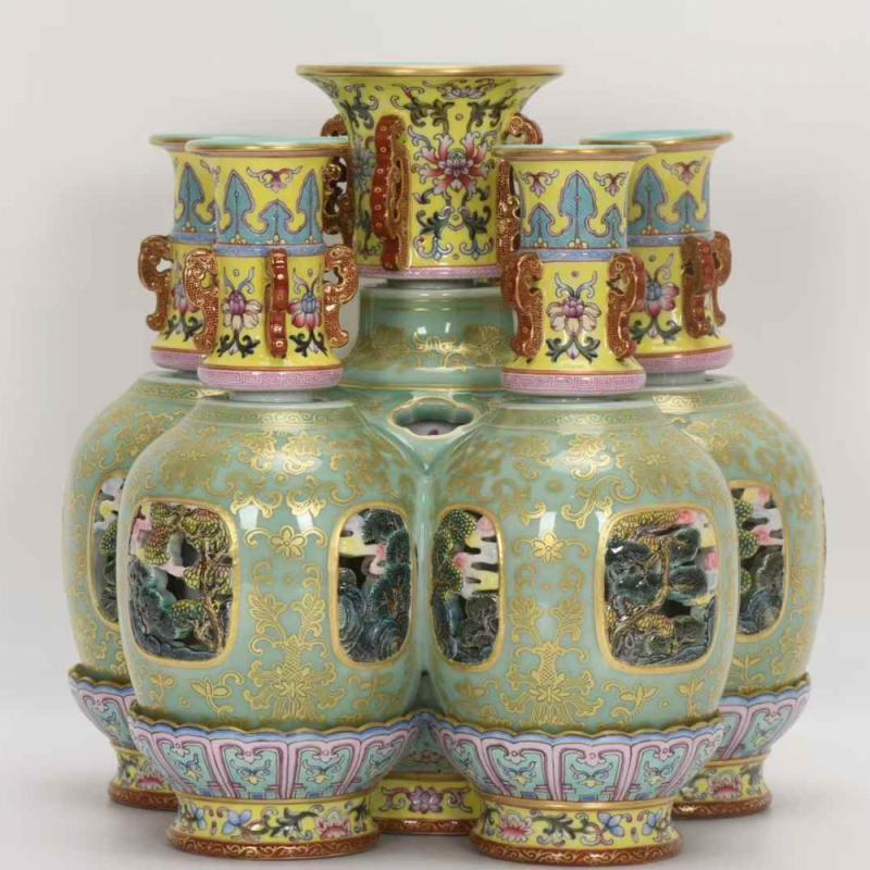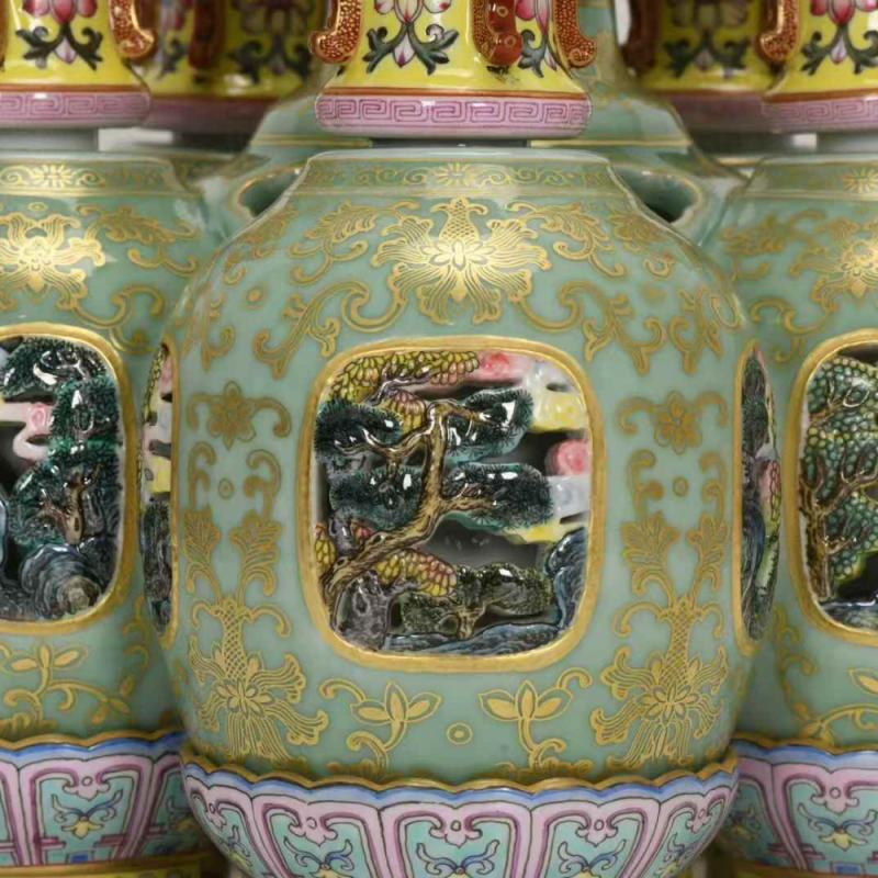 清乾隆,珐琅彩豆青镂空描金六连转心瓶,高26.5厘米,口径9.5厘米,肚径27厘米,底径23.8厘米。