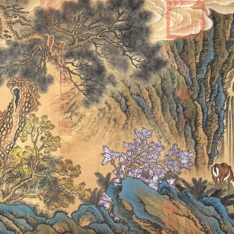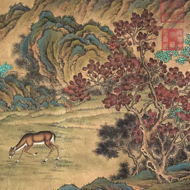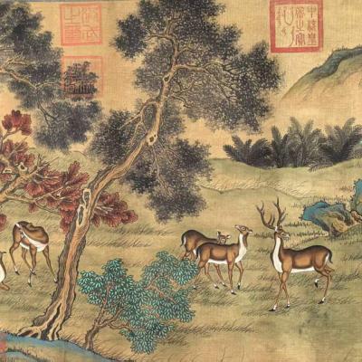 元世祖忽必烈御藏 宋 宋徽宗 精品绢本 寿天百鹿图