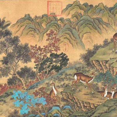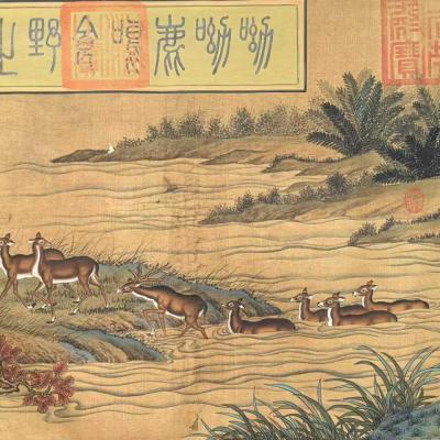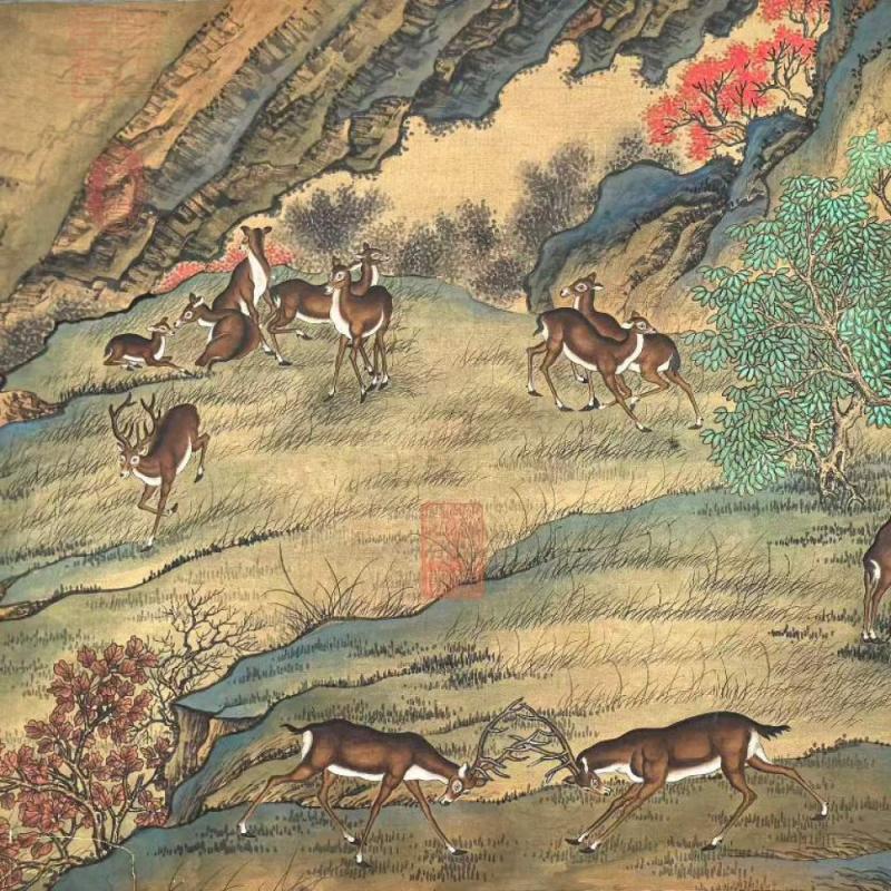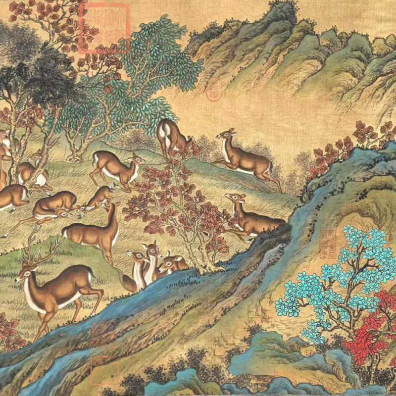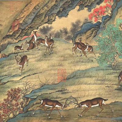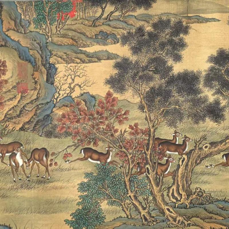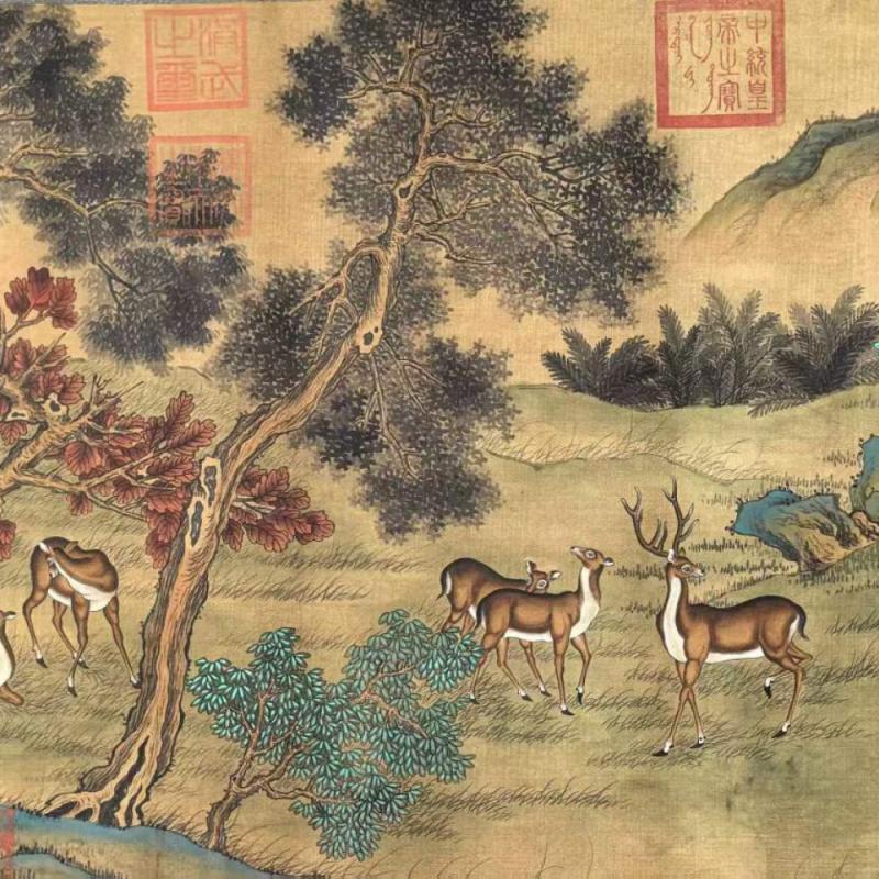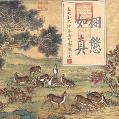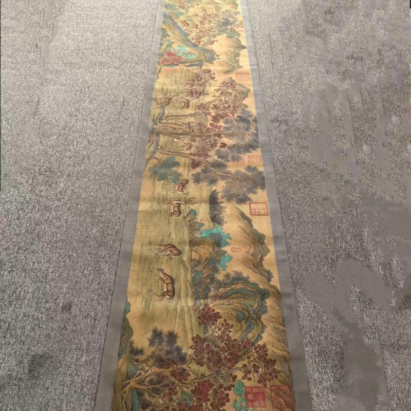 元世祖忽必烈御藏 宋 宋徽宗 精品绢本 寿天百鹿图 全长宽62.4厘米X13米左右 画心53.7厘米X7.6米左右