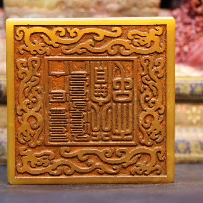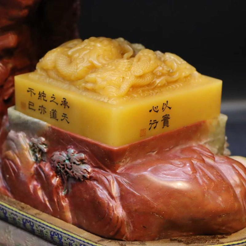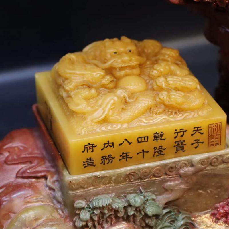 旧藏 鸡油田黄石九盘龙戏珠 乾隆天子行寶