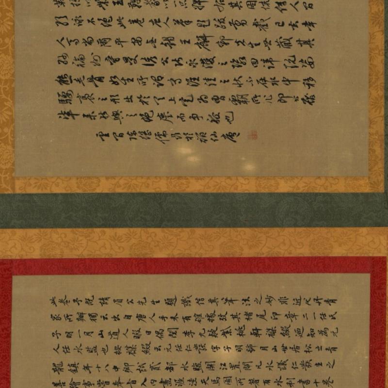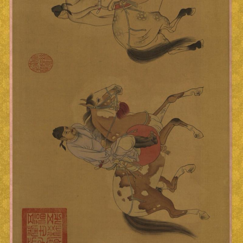 此卷予既请眉公先生题识,信其笔法之妙非近代丹青家所辨。独云:出自唐人手,未有确据,考其楮尾印章二:一任氏子明,一月山道人。暇日偶阅李九疑紫桃轩杂缀,乃知为元人任水监也,按杂缀云:元任仁发字子明号月山,世居松之青龙镇,年十八中鄊试贰,都水监开江置闸,凡水议,仁发主之。善绘事,尝奉旨入内画渥洼天马图。所著有水利书十卷。今人止称任水监,画马盖以艺掩云。然则任以画马得名甚着,而眉公未及详核,因附记于此。崇祯壬申(1632年)二月之七日辋川馆主人记。