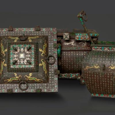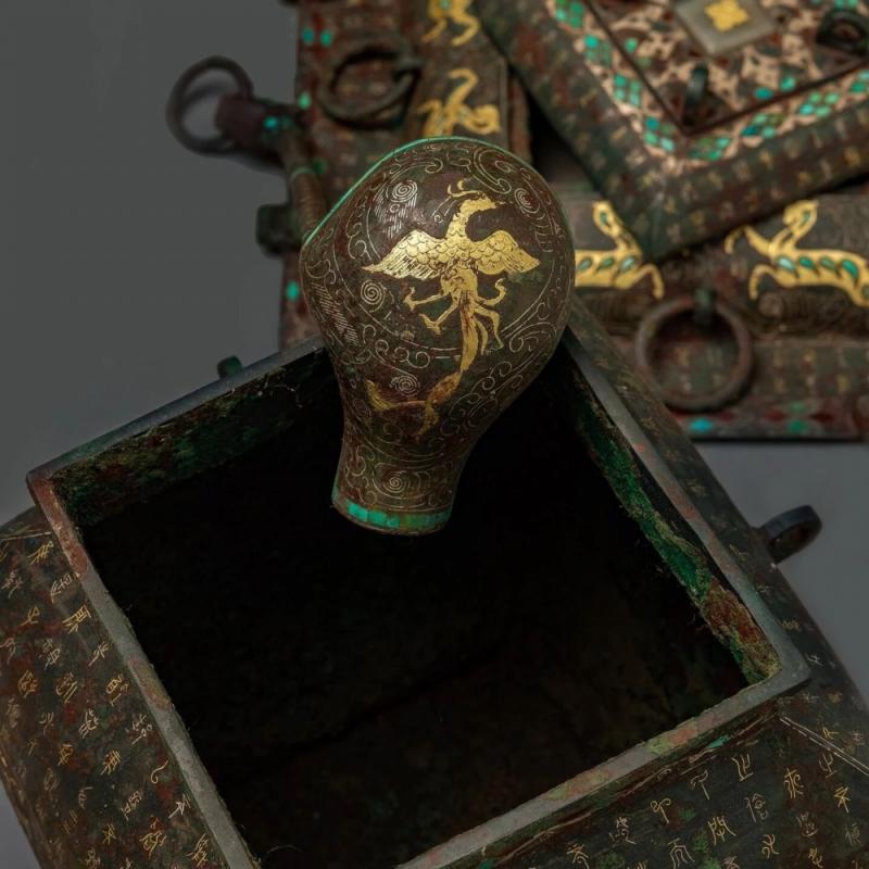 战国青铜镶宝石错金银滿铭文冰鑑―套