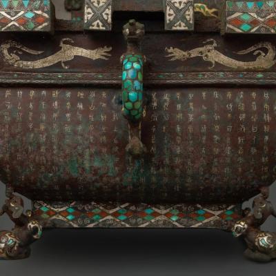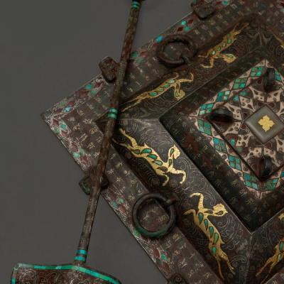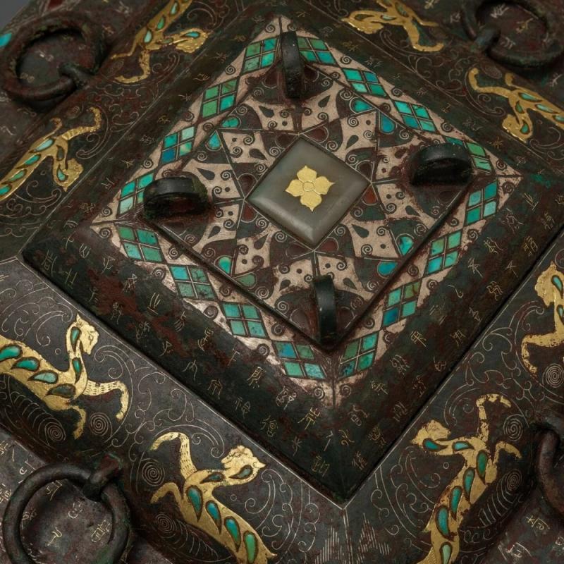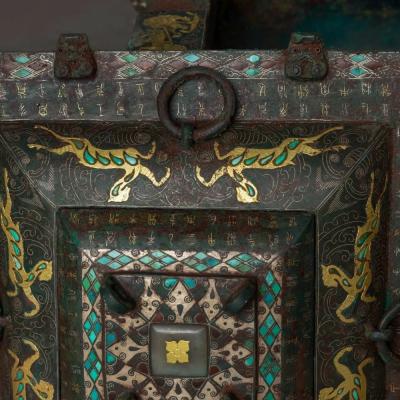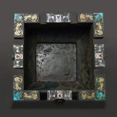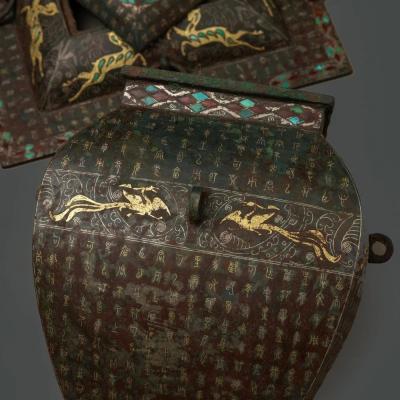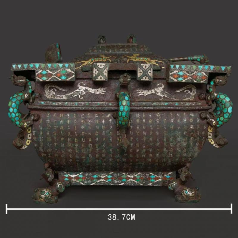 战国青铜镶宝石错金银滿铭文冰鑑―套,包浆厚重,工艺精湛,龙型作腿,气势不凡,精品中的精品,藏馆级天花板!尺寸如图。