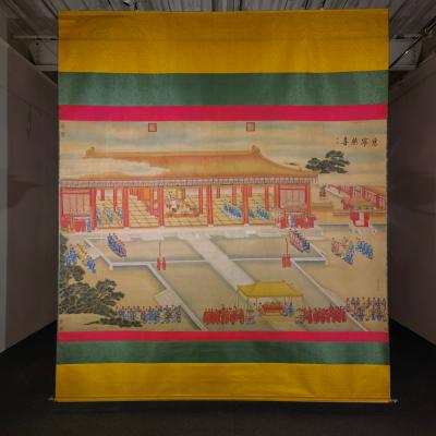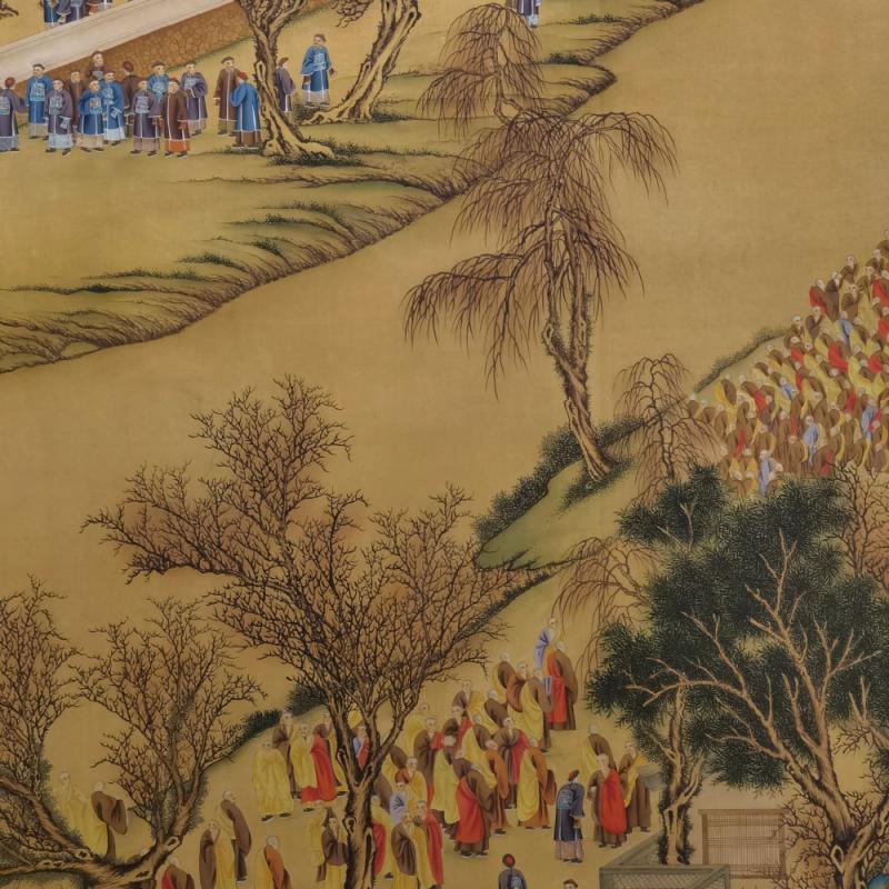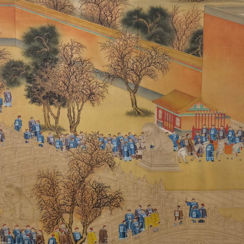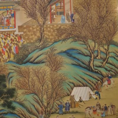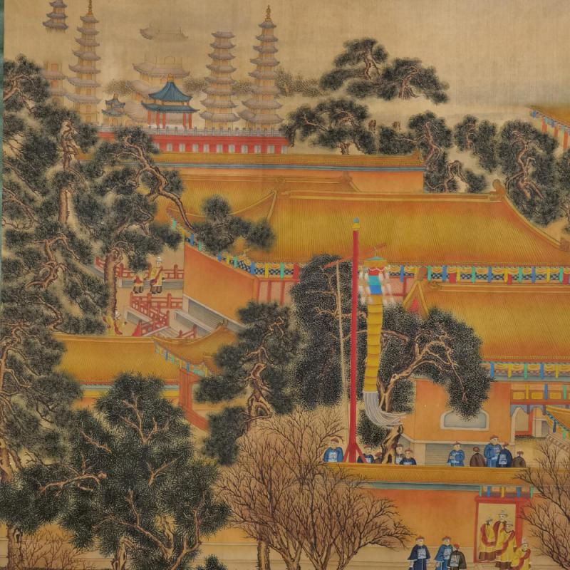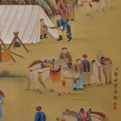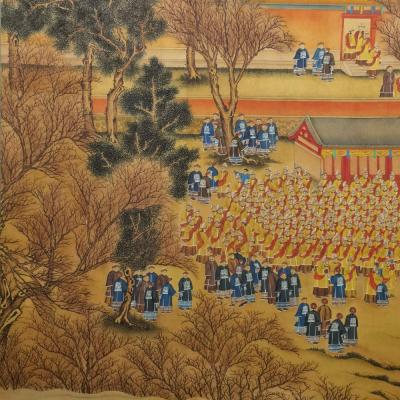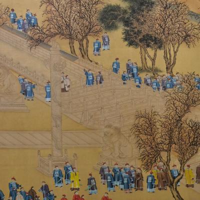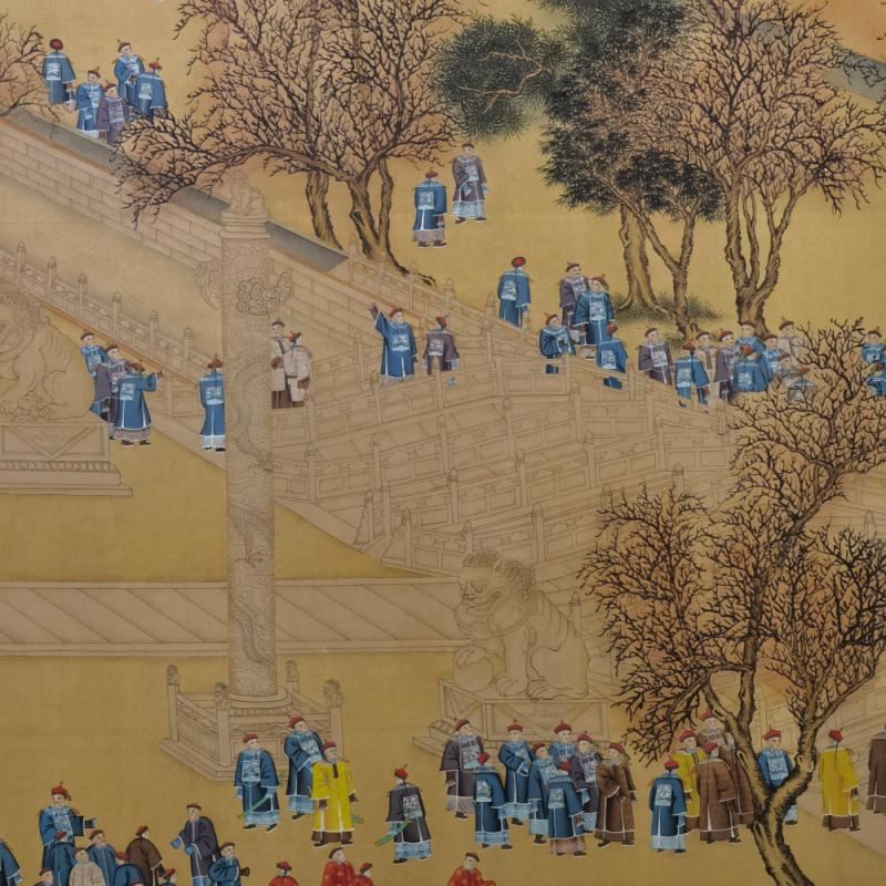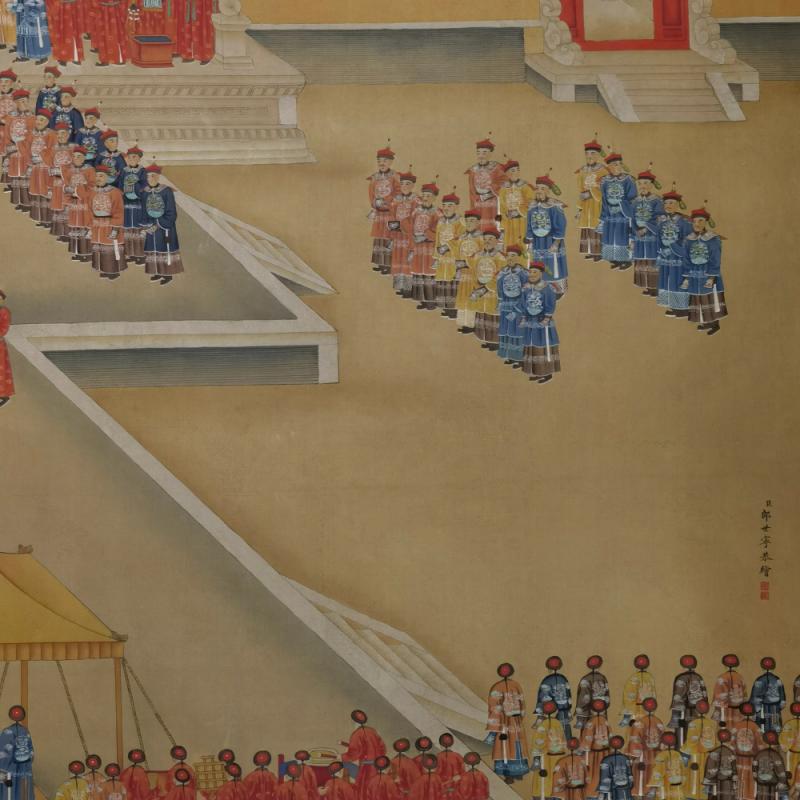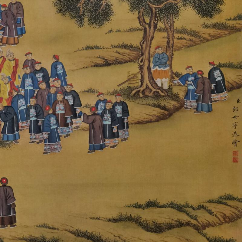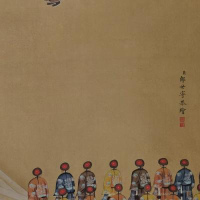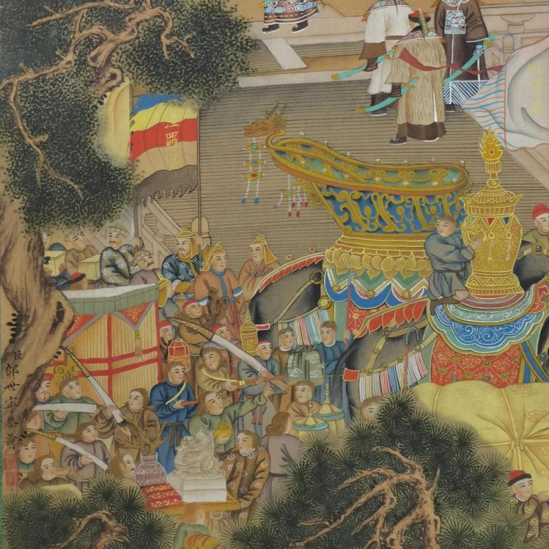 郎世宁巨幅绢本《胪欢荟景万国来朝贺寿圖》,乾隆二十六年辛巳,恭逢崇庆慈圣皇太后七旬万寿。乾隆皇帝敕西洋画臣郎世宁恭制胪欢荟景图,胪列祥瑞,用彰懿德。原装黄花梨大木盒保存完好,极品中极品!单幅尺寸:353cmx300cm