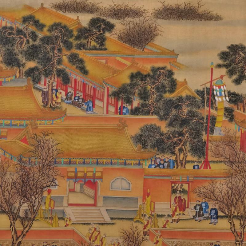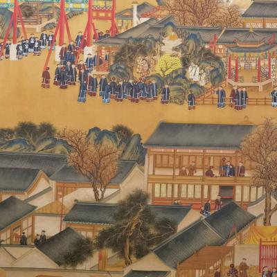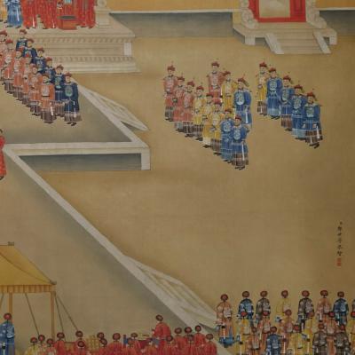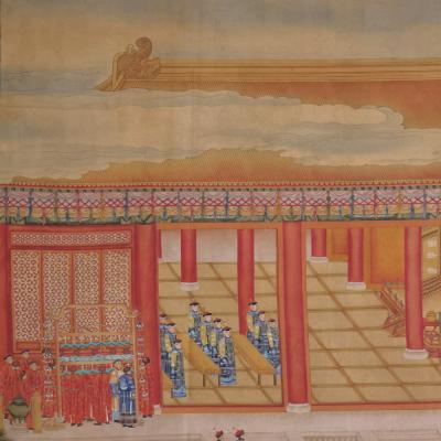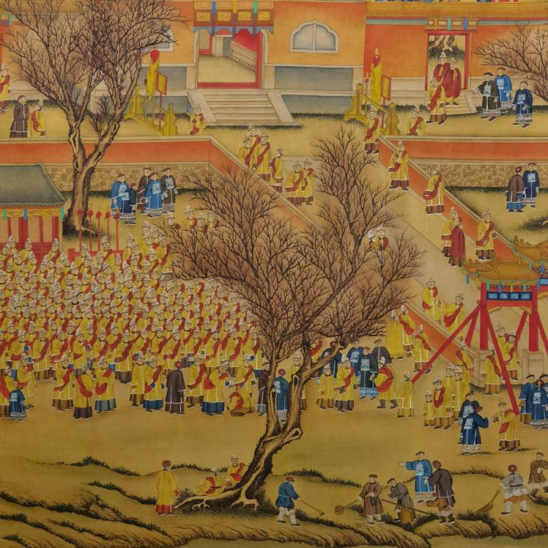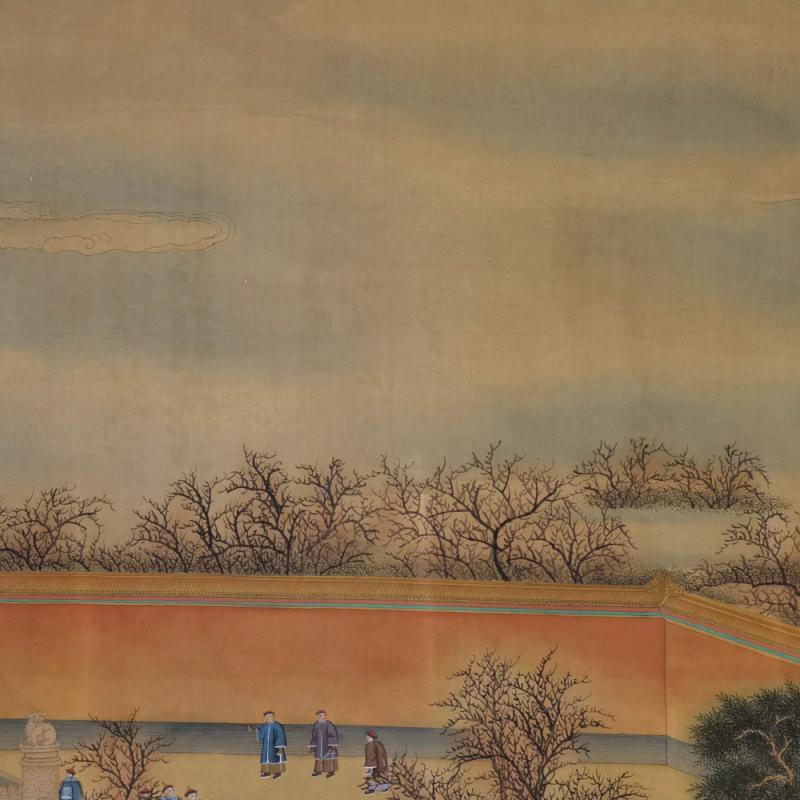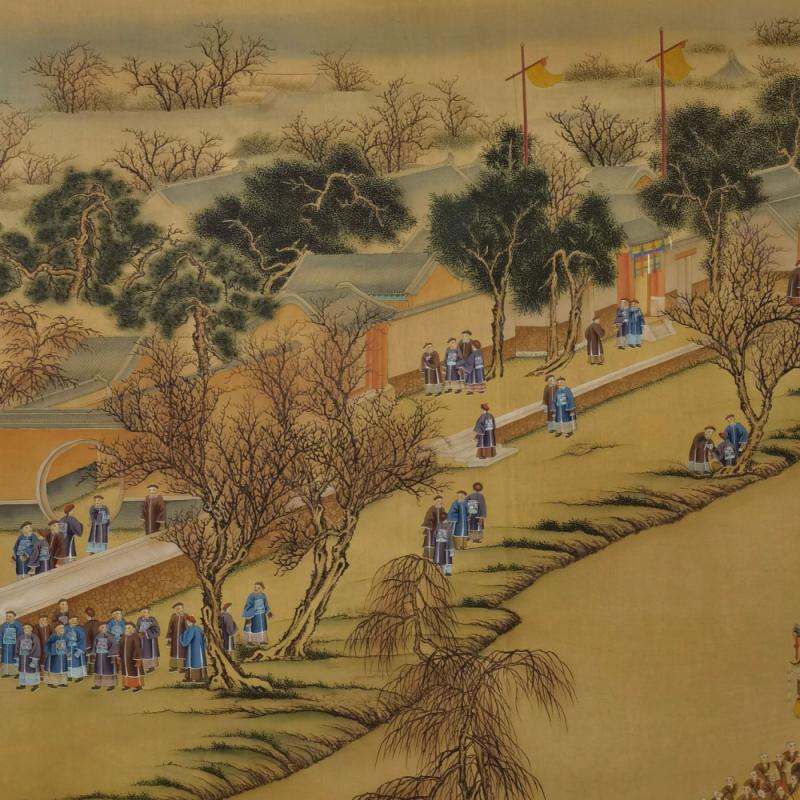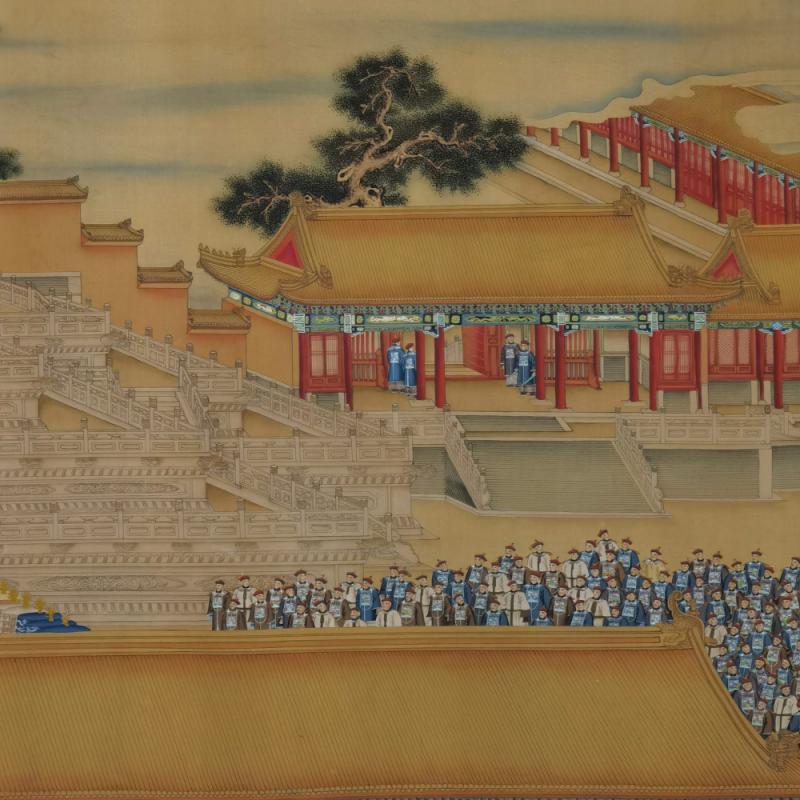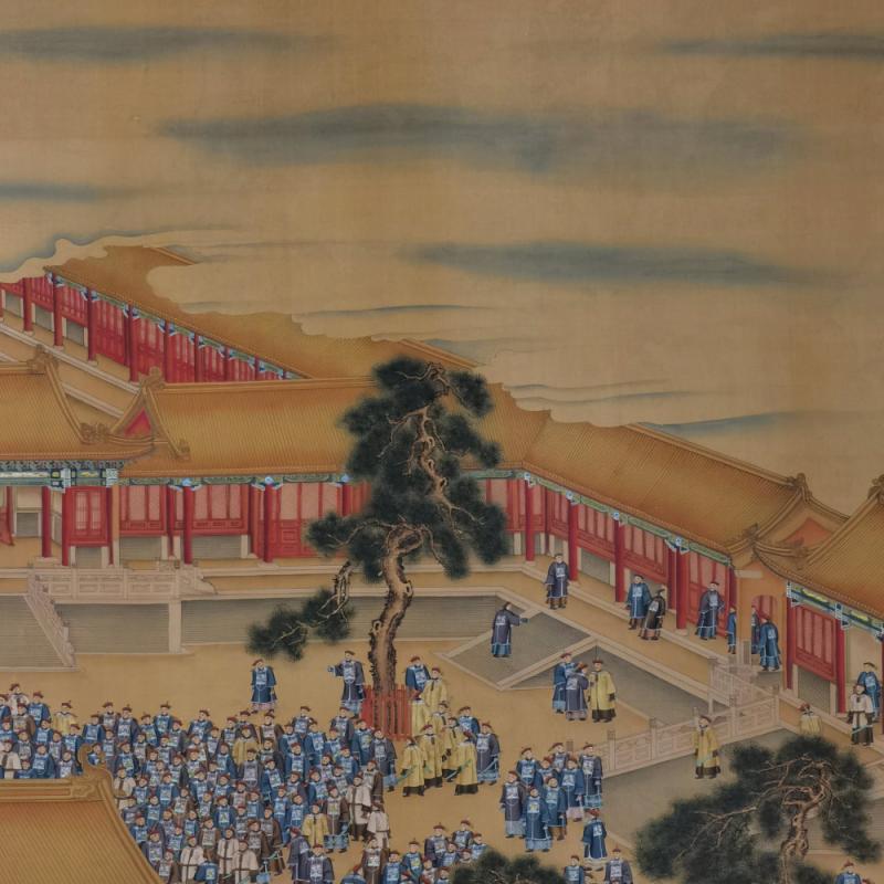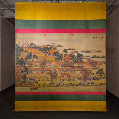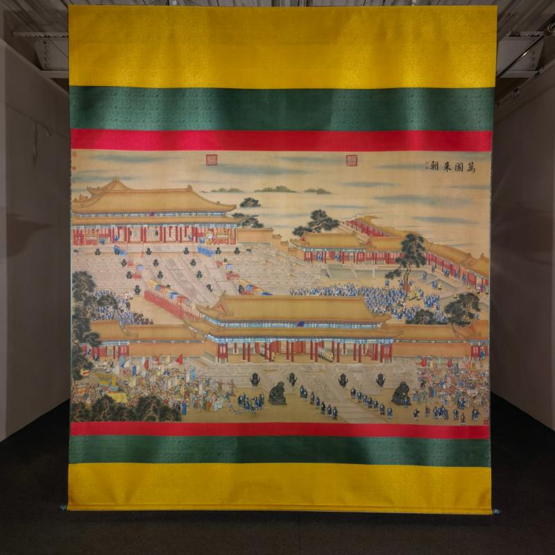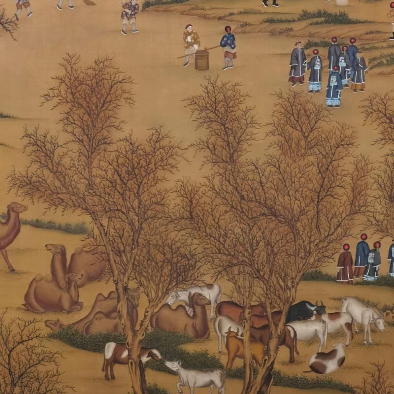 郎世宁巨幅绢本《胪欢荟景万国来朝贺寿圖》,乾隆二十六年辛巳,恭逢崇庆慈圣皇太后七旬万寿。乾隆皇帝敕西洋画臣郎世宁恭制胪欢荟景图,胪列祥瑞,用彰懿德。原装黄花梨大木盒保存完好,极品中极品!单幅尺寸:353cmx300cm