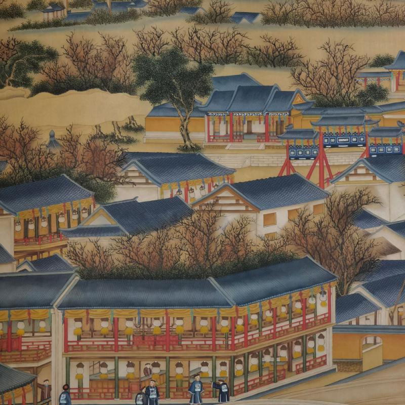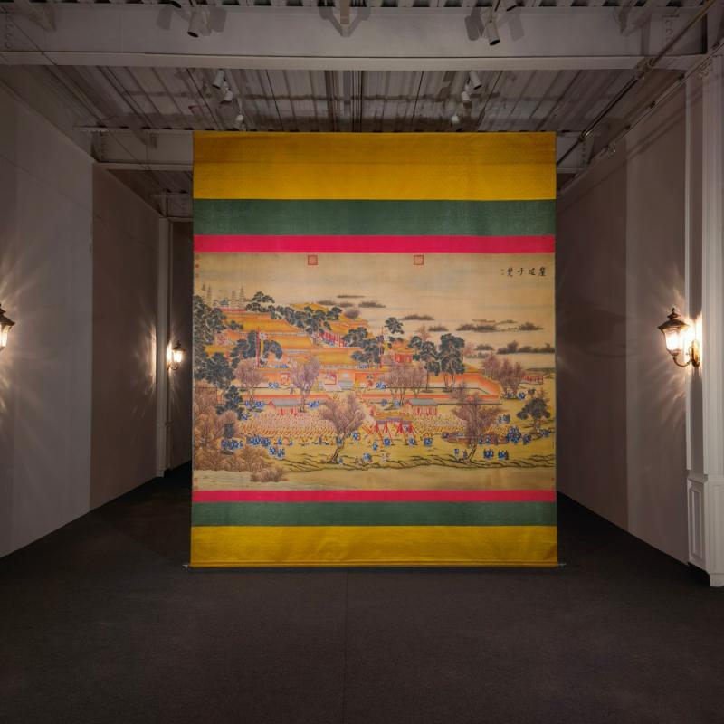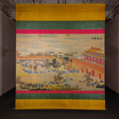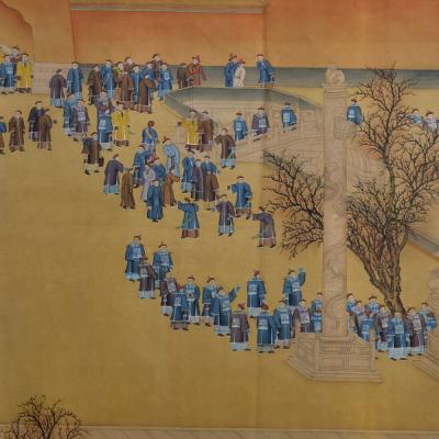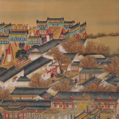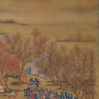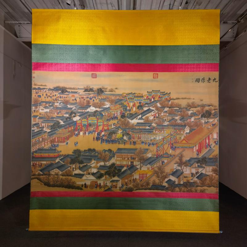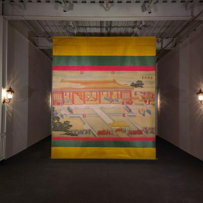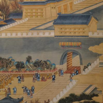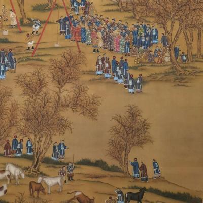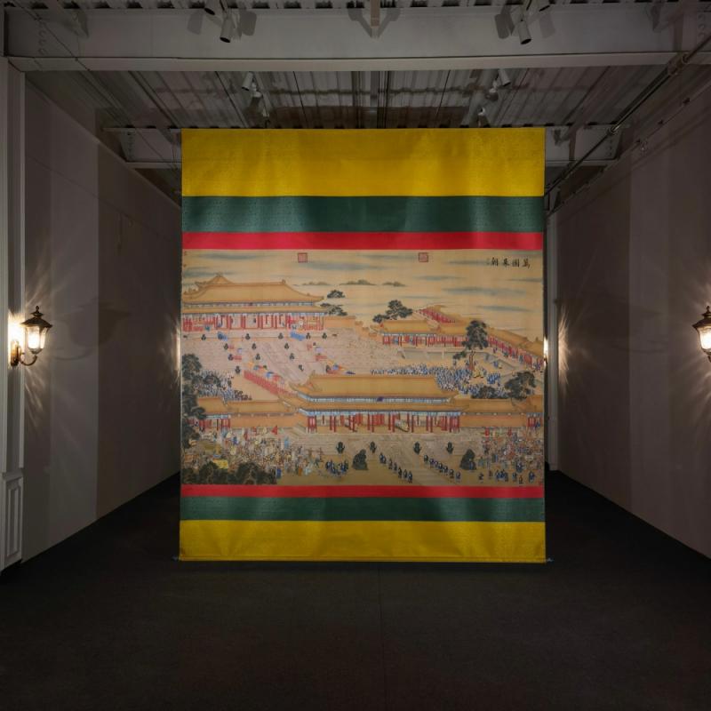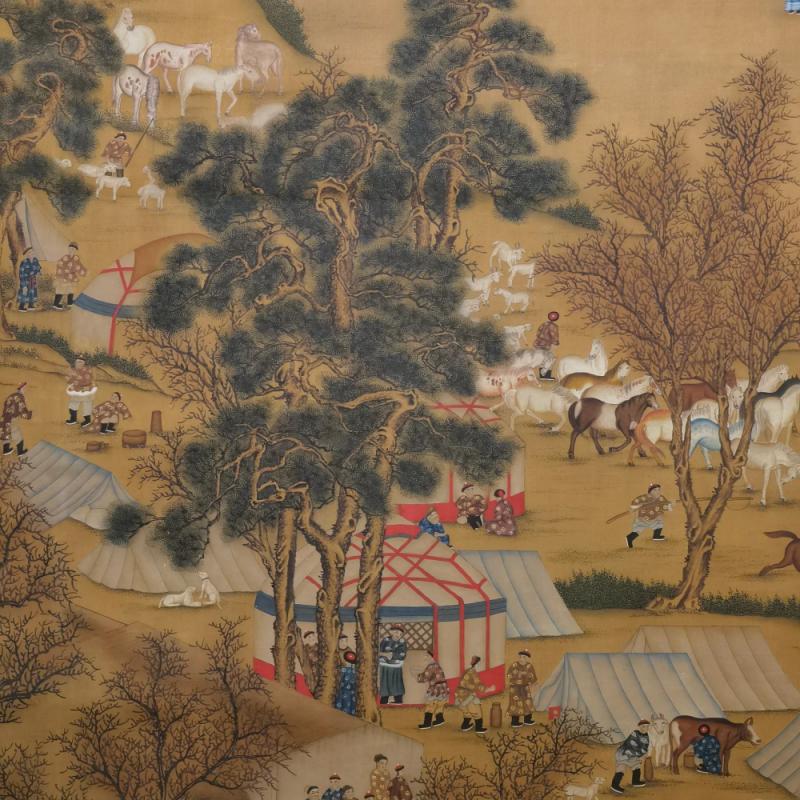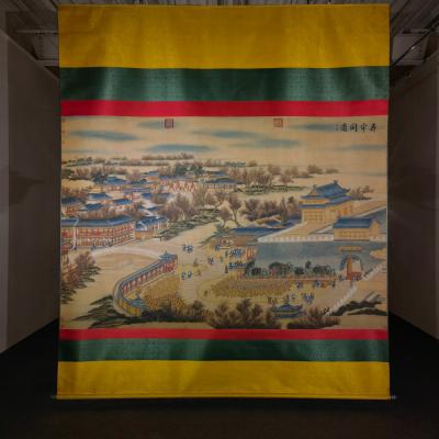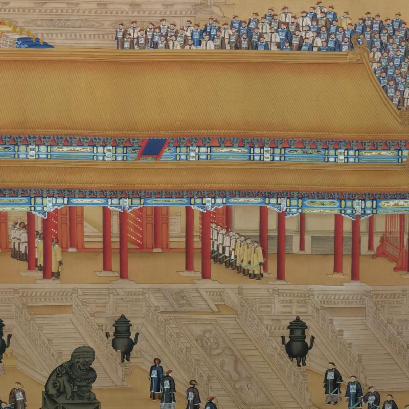 郎世宁巨幅绢本《胪欢荟景万国来朝贺寿圖》,乾隆二十六年辛巳,恭逢崇庆慈圣皇太后七旬万寿。乾隆皇帝敕西洋画臣郎世宁恭制胪欢荟景图,胪列祥瑞,用彰懿德。原装黄花梨大木盒保存完好,极品中极品!单幅尺寸:353cmx300cm