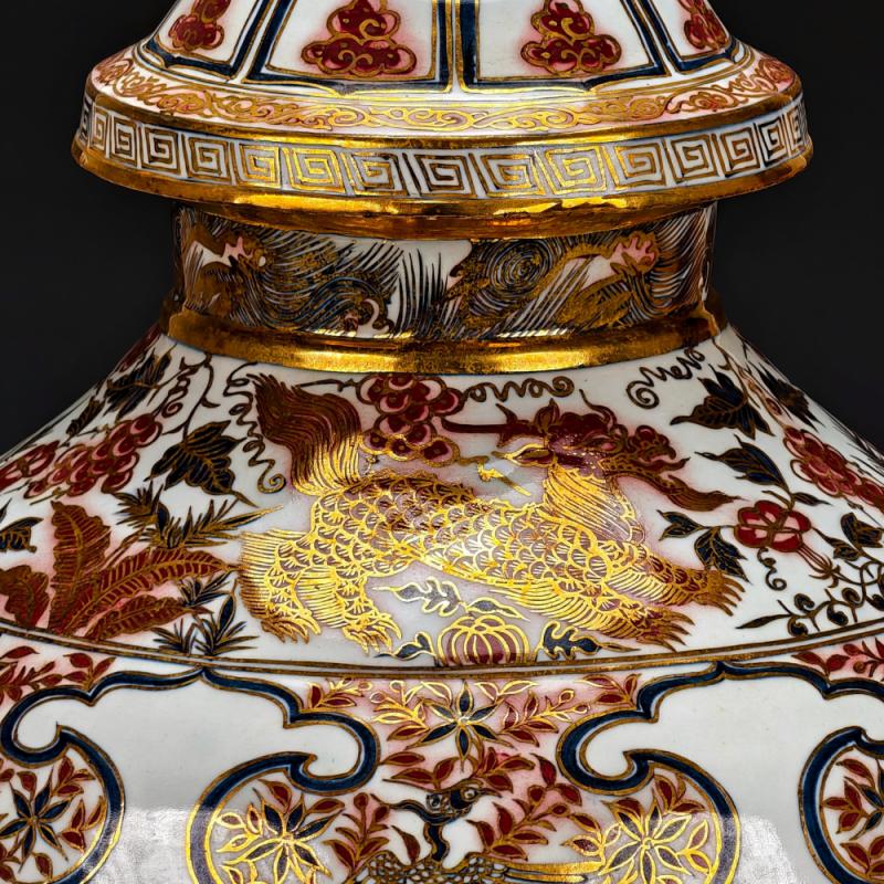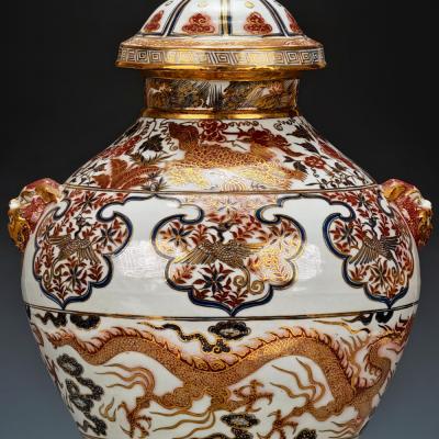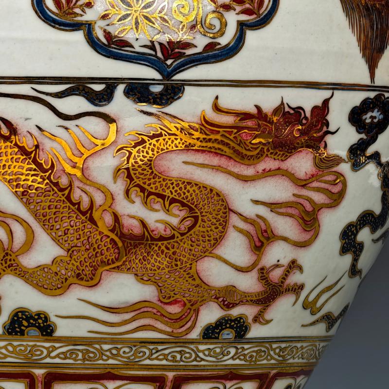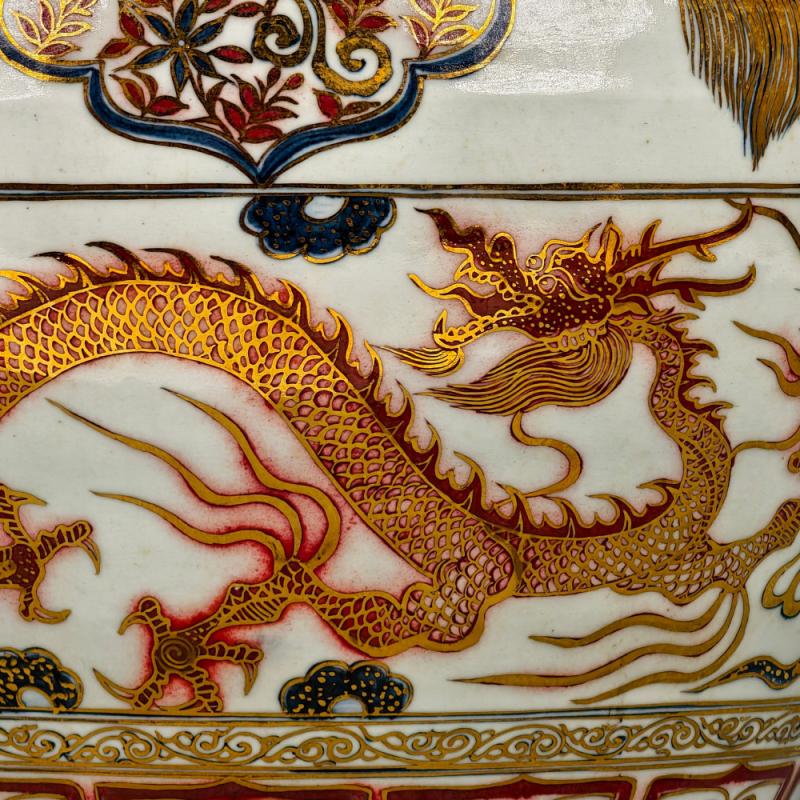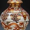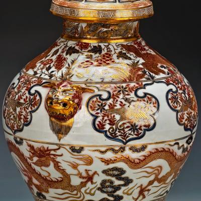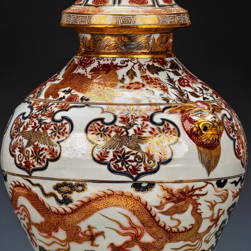 ♦【相古博陵第·至顺三年良辰】至顺元青花·青花釉里红·描金通景满绘“穿云龙”纹兽首贯耳盖罐。
