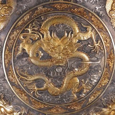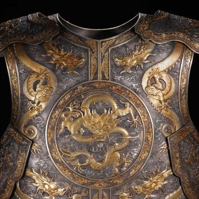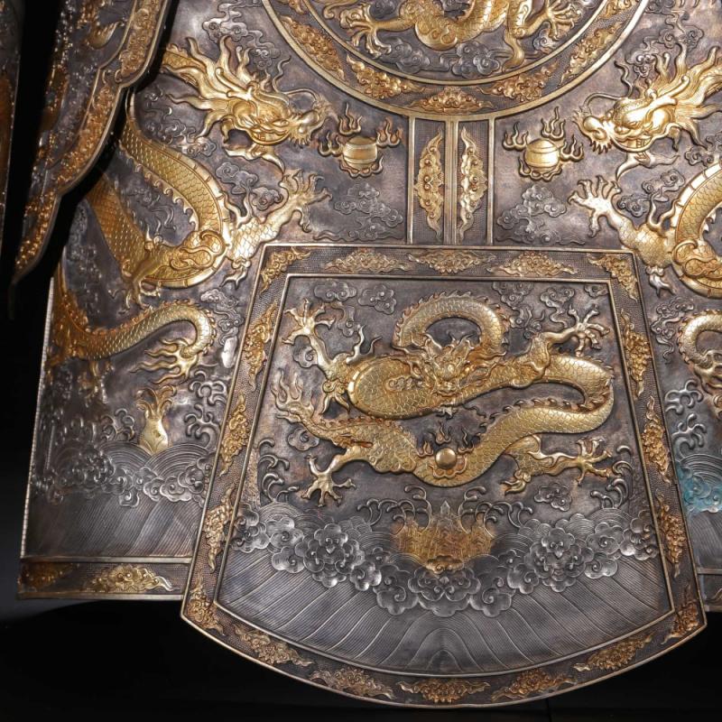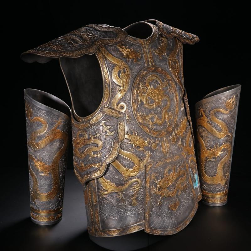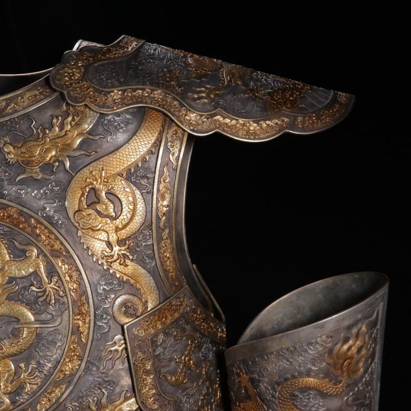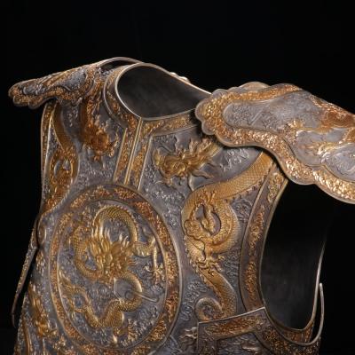 清代 鎏金雕龙纹礼甲一套 规格:盔甲高55cm宽62cm 护臂长37cm宽13cm重15.6kg