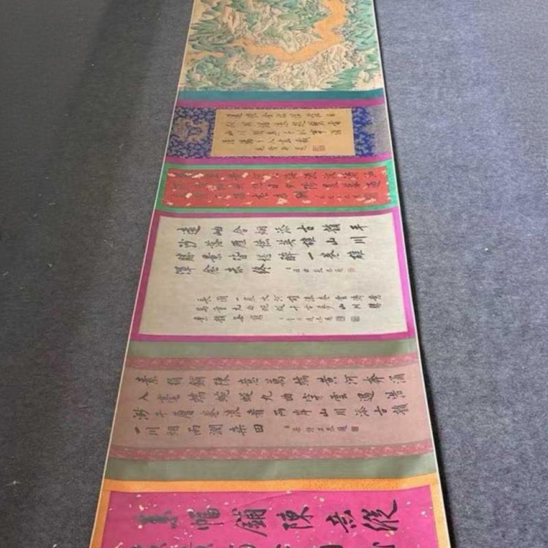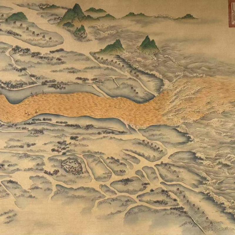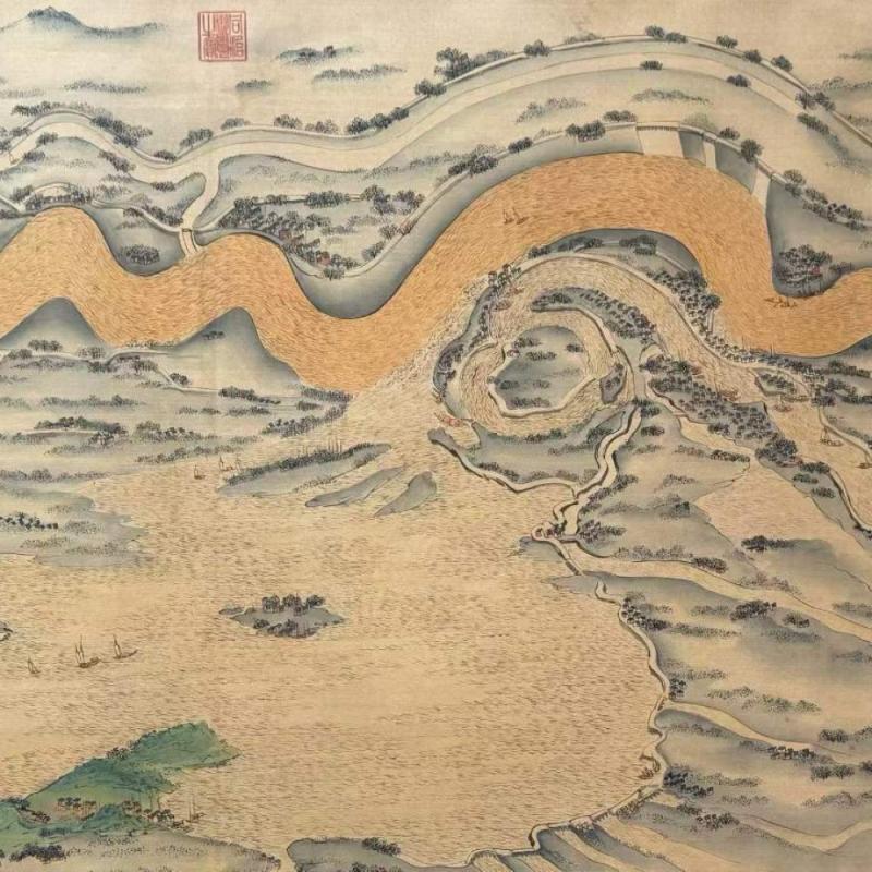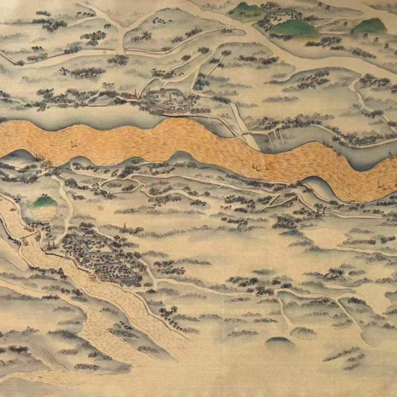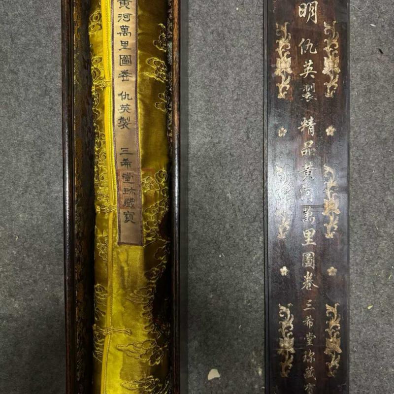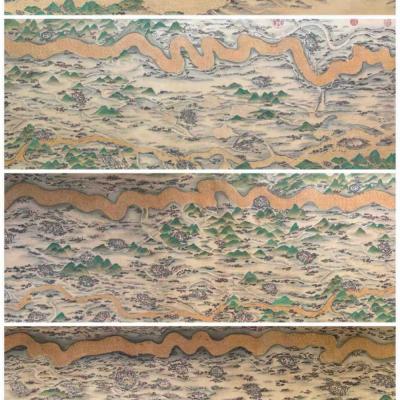明、仇英、精品绢本(黄河万里图)第一段,画心尺寸:68x1055厘米,总长:1762厘米。该画作通过描绘青海三江源头至山东东营入海口的黄河全貌,展现了沿黄九省的自然风貌与人文景观,涵盖西夏王陵、成吉思汗陵园等历史遗迹,将黄河作为“中华民族母亲河”的文化内涵具象化。(收藏最佳—妙品)手卷