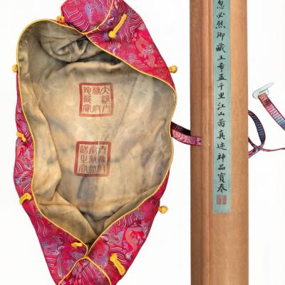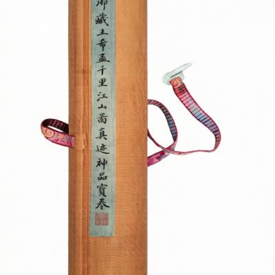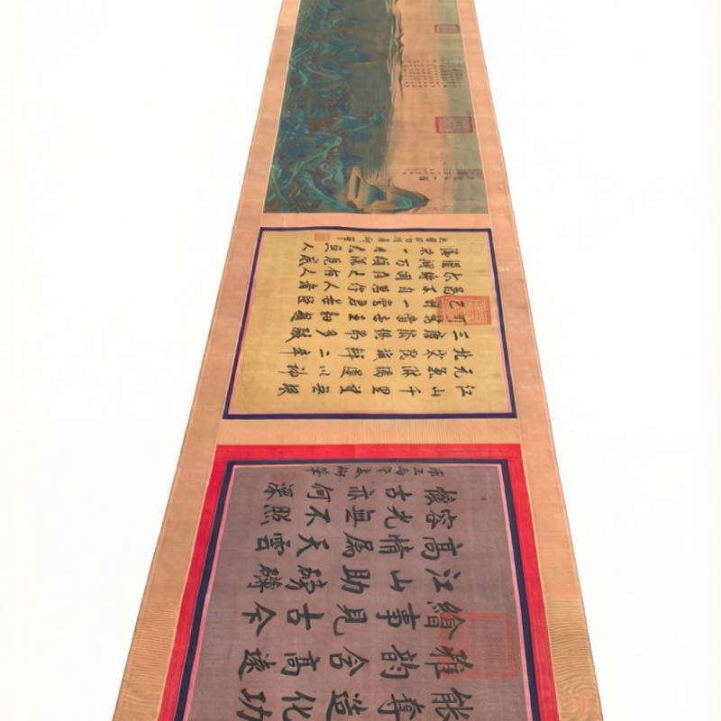 乾隆御笔:江山千里望无垠,元气淋漓运以神,北宋院诚鲜二年,三唐汯縂弗多皴,可惊当世至和赵,己讶一堂君若臣,昌不自思作人者,尔时调鼎作人者,澄湖万顷深见底,清水冰一片光照人。