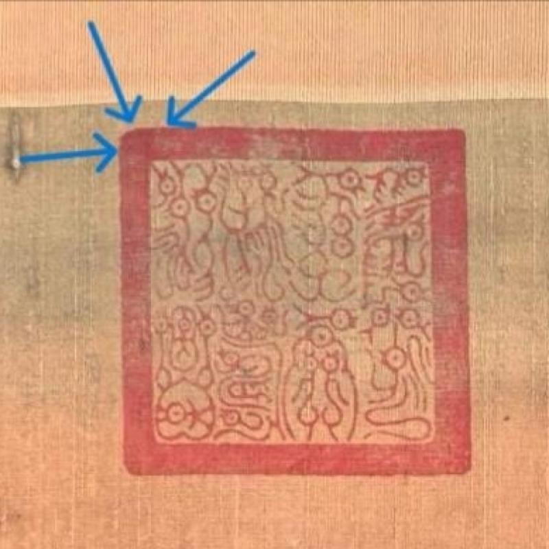 最后一张照片,蓝色箭头位置印纹边框左上角,有着明显的裂缝,合付史书记录,在汉代被摔破一角,这个事件发生在西汉末年,当时王莽篡汉自立,向太后王政君索要传国玉玺(秦始皇命丞相李斯以鸟虫篆字雕刻)。王政君在愤怒中将玉玺摔在地上,导致玉玺崩裂了一个角,王莽无奈,令工匠以黄金补之。另外玉玺方四寸(相当于现在的9.2厘米),上面雕刻交盘龙,底面用虫鸟篆字刻了八个大字:“受命于天,既寿永昌”。