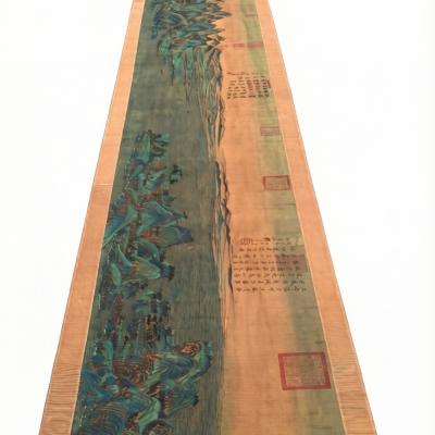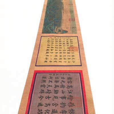 徽宗:王希孟少有天赋其性可敎朕亲授其法艺精进画遂超越矩度此图敷彩精细轻重浓淡生动活脱秀丽多姿雄伟壮观无不出以精心运以细毫至臻上品矣。