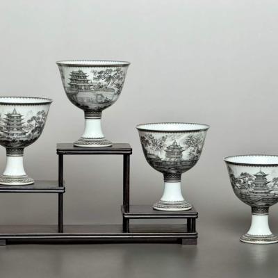 大清雍正年制 墨彩描金图案边 四大名楼 高足杯一套